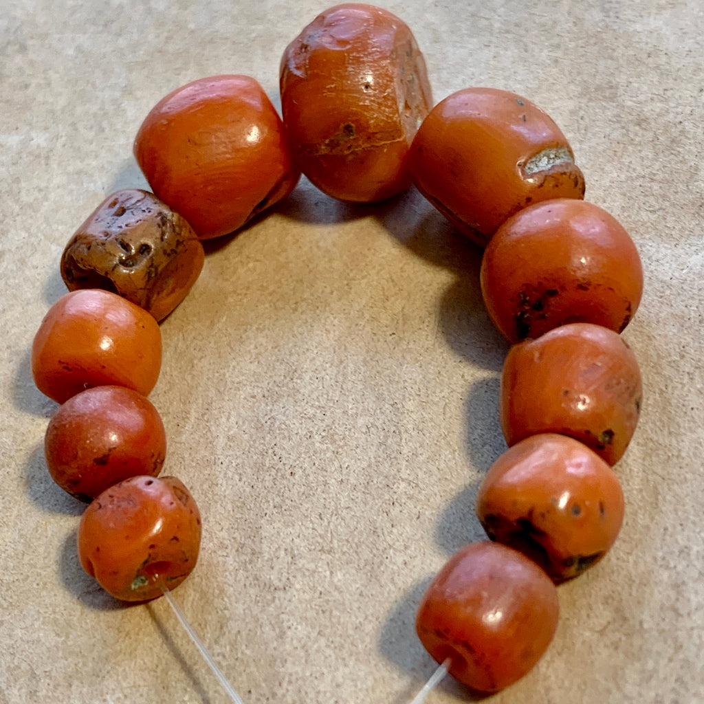 11.7 gram mini-strand of 11 graduated antique Berber coral beads from Morocco. Sizes ranging from 7mm -13mm in diameter with a small .8mm hole. Berber coral, 2-400 years old, Mediterranean Sea origin, nice deep red/orange color. 11 beads, excellent quality!
