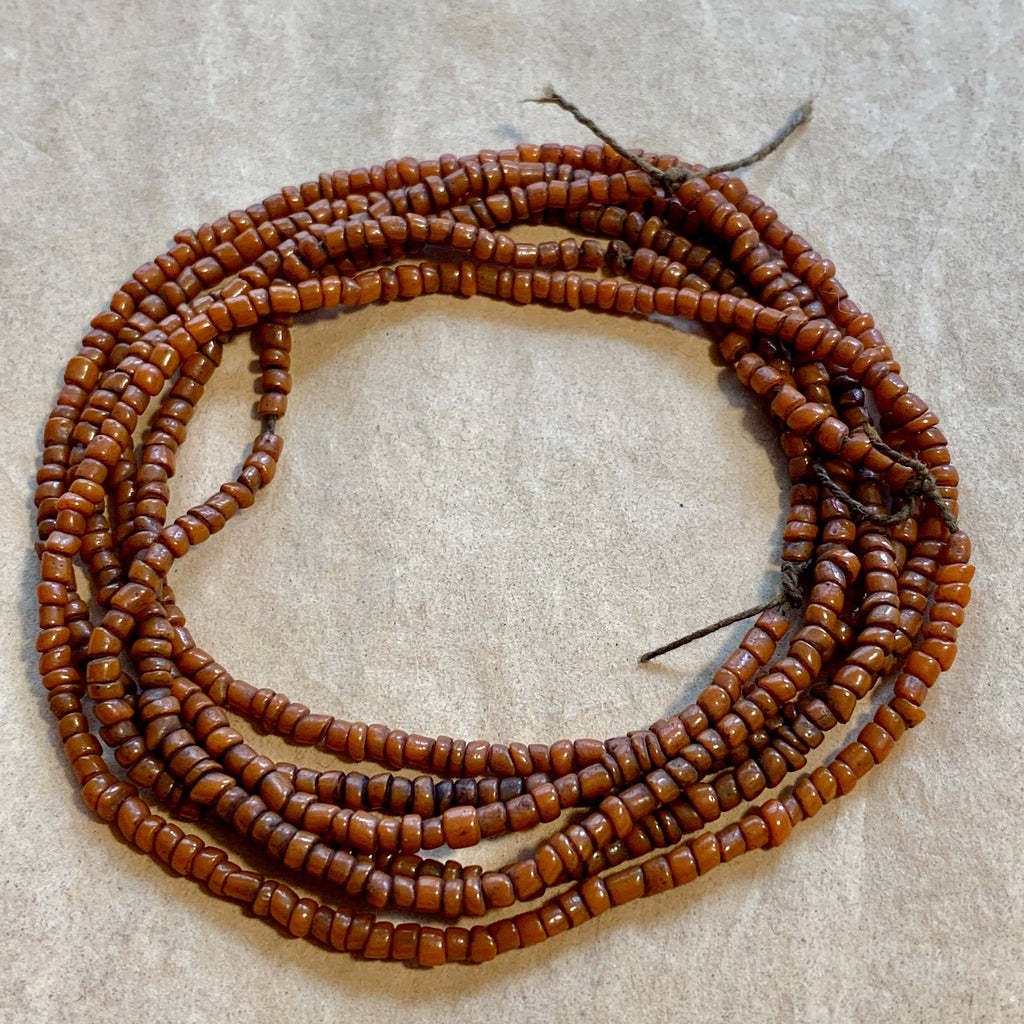 Extra-long 38-42 inch strand of irregular brick brown glass beads from the Bondo Tribe of the state of Odisha (formerly Orissa), an eastern Indian state on the Bay of Bengal. These beads are about 200 years old! Average bead size is 2-2.5mm, about a size 9º seed bead with a 1mm hole. The Bonda tribe is one of the oldest and most primitive in mainland India, their culture has changed little for more than a thousand years.