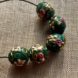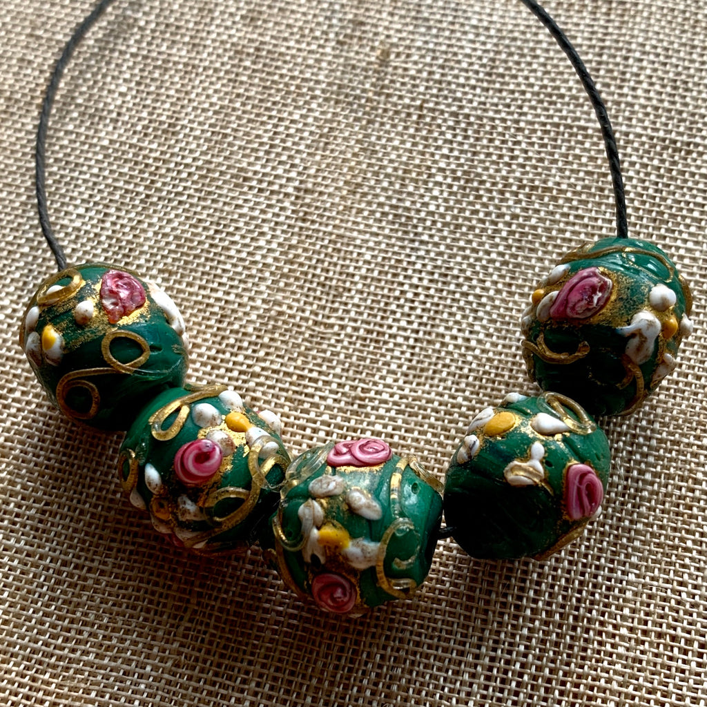 Set of 5 green glass beads, wedding cake style, from Venice, early 1900's, with pink, yellow, and white, with aventurine, complex and ornate patterns, 5 round beads measuring 11mm diameter. Beautiful craftsmanship! Sold as a set of 5 beads only. Patterns are raised in the classic wedding cake style, in good condition!