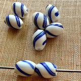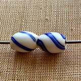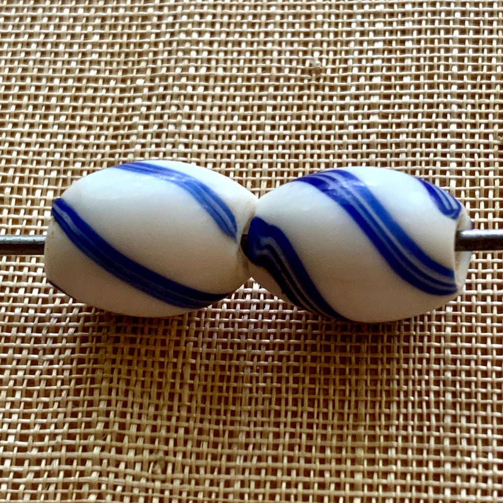 Antique Venetian-made white glass beads from the late 1800s and traded in Africa. With wonderful swirly blue stripes. Beads average 13mm long x 9mm diameter with 2-2mm hole. Photo shows the slight pattern variation to these beads. Excellent condition! Sold in pairs, price is for two beads.