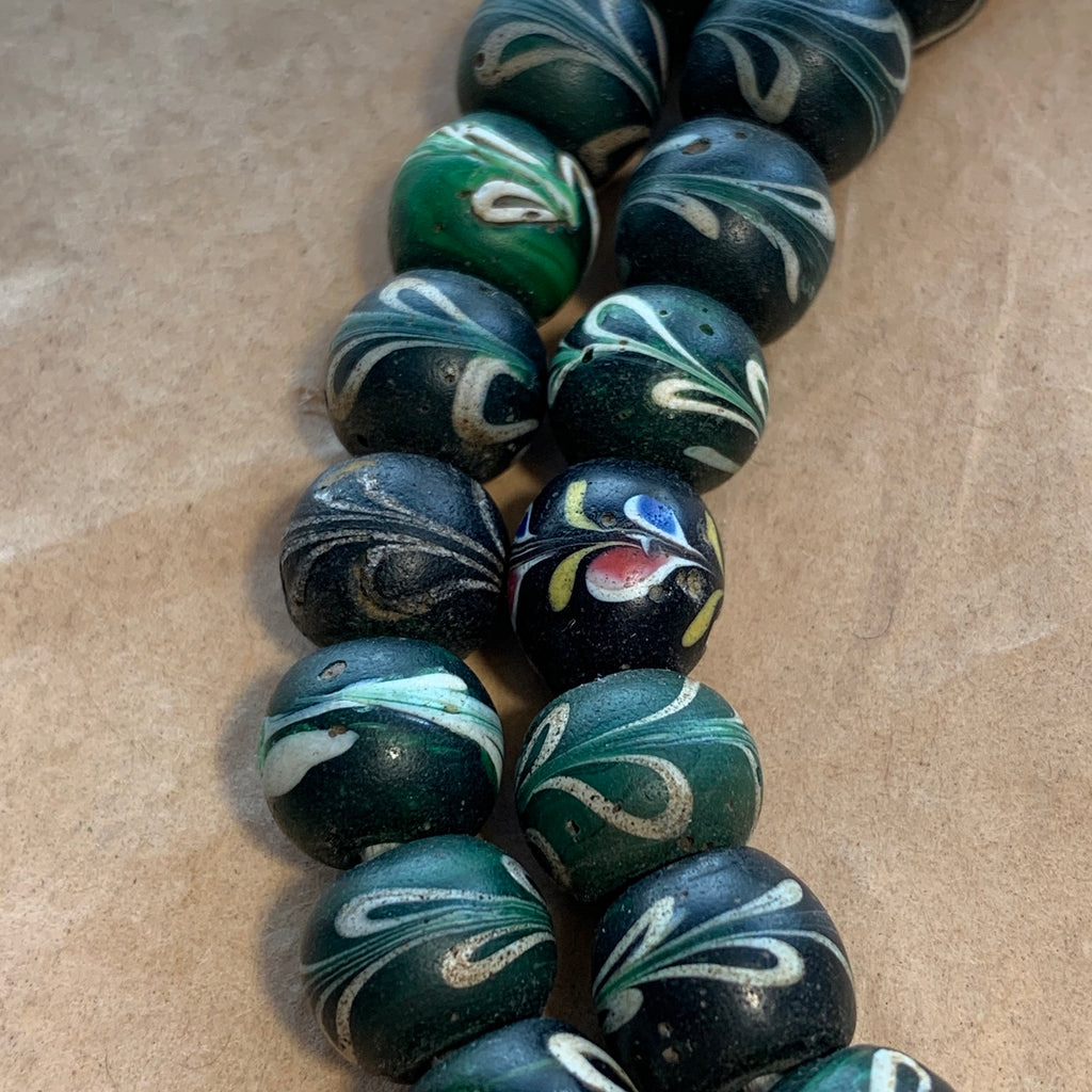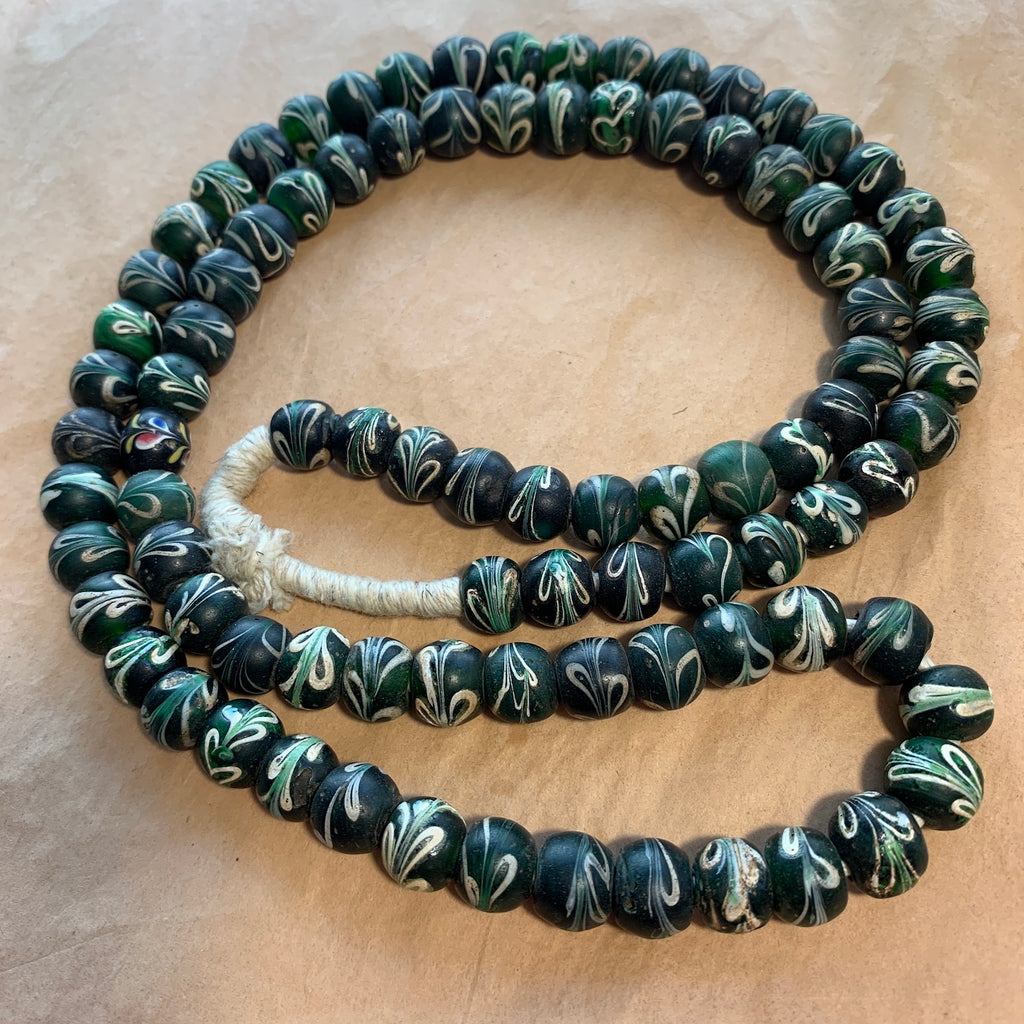 1700's Venetian fancy dark green semi-transparent green bead with white feathering patterns around circumference, very collectible and rare! Average size is 12mm diameter with 2-3mm hole. These were primarily traded in Nigeria. This rare strand has 90 beads and is 32 inches long. See listing GTBAFR1031 for individually priced green feather beads!