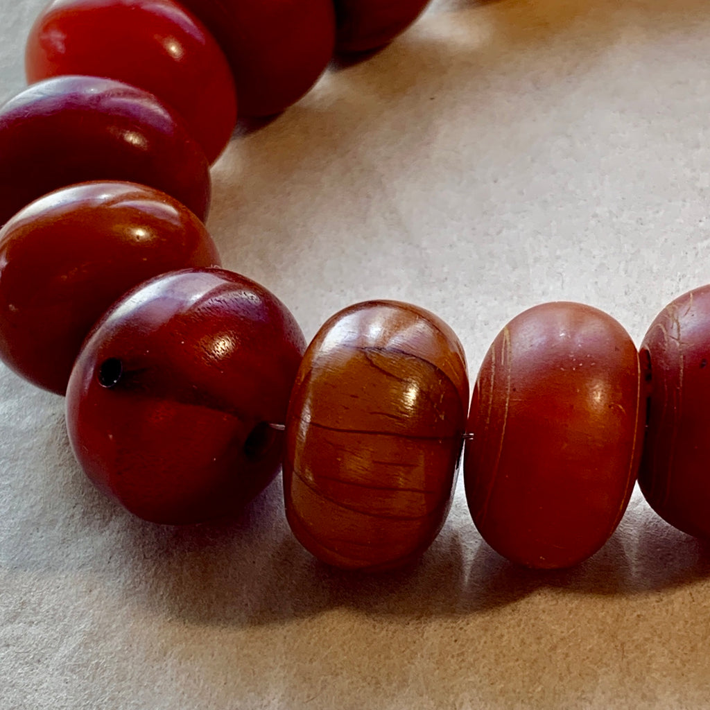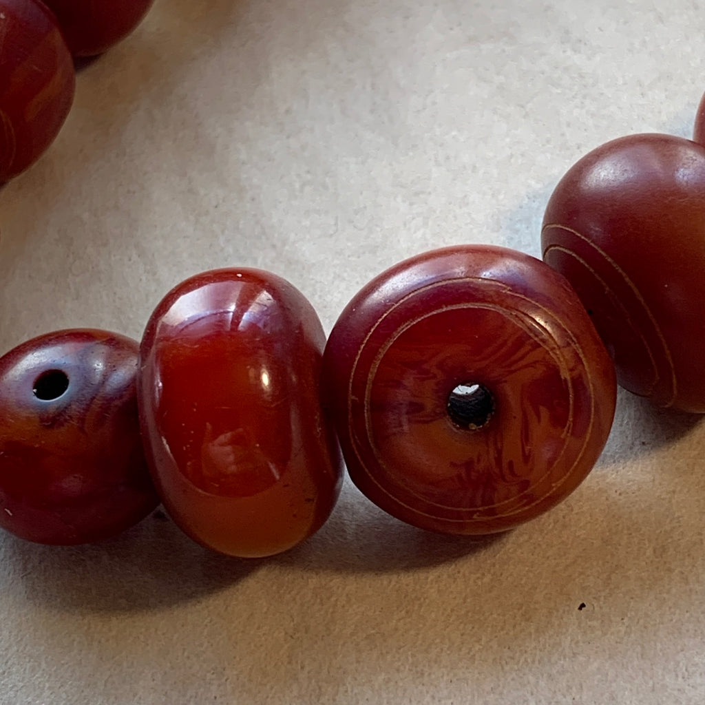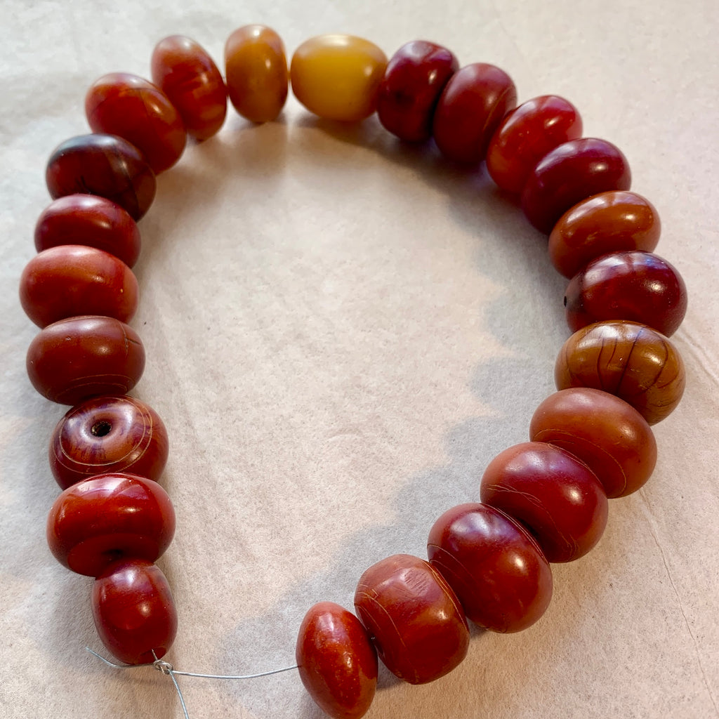 Large German resin amber beads, lovely variety! 20-35mm diameter x 22mm thick, with 2-3mm holes. Approximately 100 years old, found in Mauritania and Niger. This is an imitation amber, (like Bakelite, referred to as Phenolic Amber) made from plant resin in Germany in the early 1900's and traded in West Africa. These have become quite rare. A wonderful focal bead element, or restring as is! Strand is 15 inches long with 23 beads. Color and shape variety!