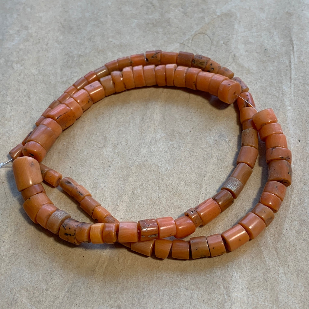 14 inch long strand of beautiful Uzbek salmon coral beads, Mediterranean Sea, over 100 years old. Soft salmon color, graduated cylindrical shapes. .5mm holes, 3-7mm diameter x 3-7mm tall, 87 beads on the strand, 16.5 grams. A lovely color! Last photo shows 3 strands, this one is the inner strand.