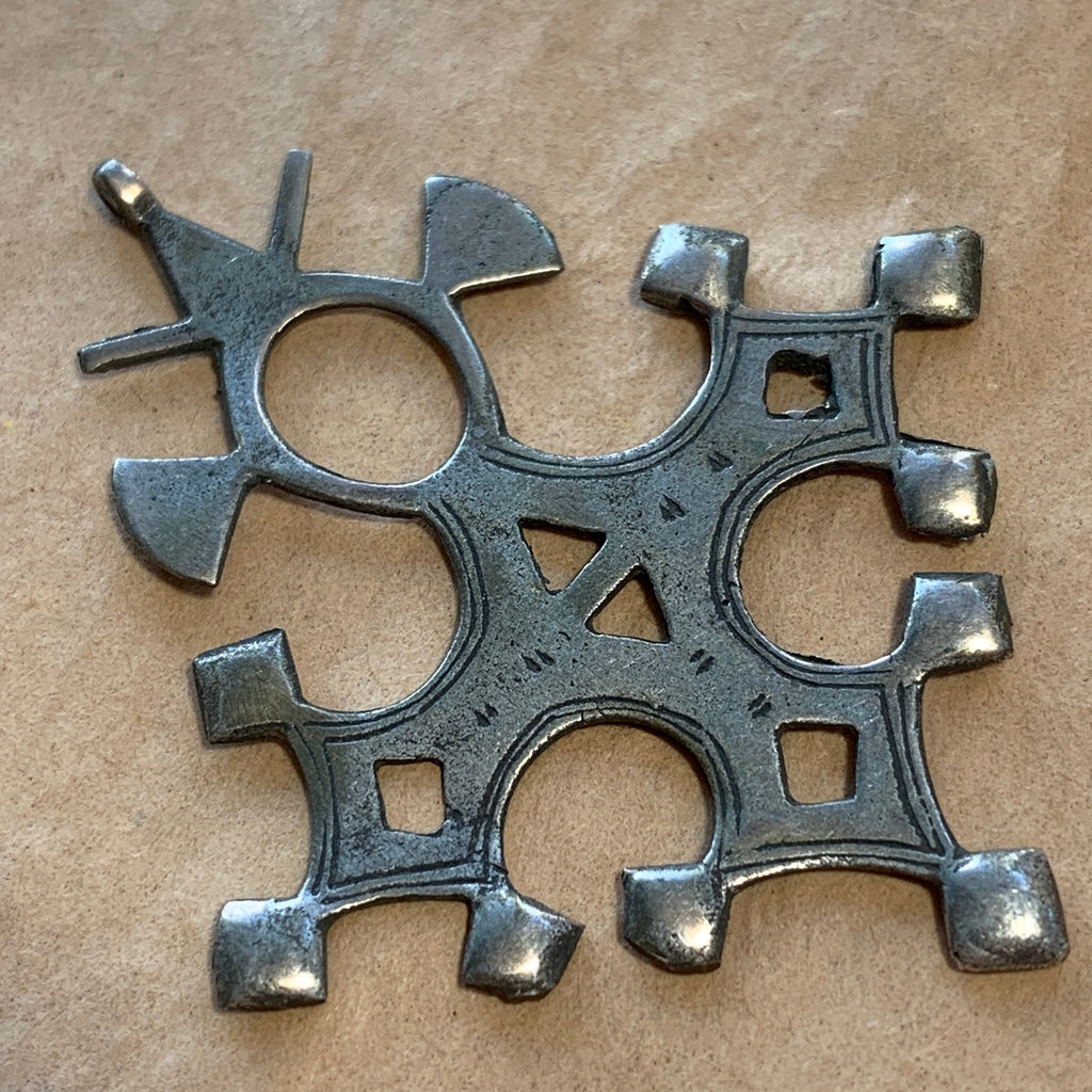54mm tall x 46mm wide x 3-5mm thick, traditional fabricated silver pendant, sterling silver. Vintage 1980's, hand made in Mali, Tuareg Tribe. Traditionally worn by men, intricate engravings, small 1.5mm opening for stringing, now becoming quite rare in this high-silver content.