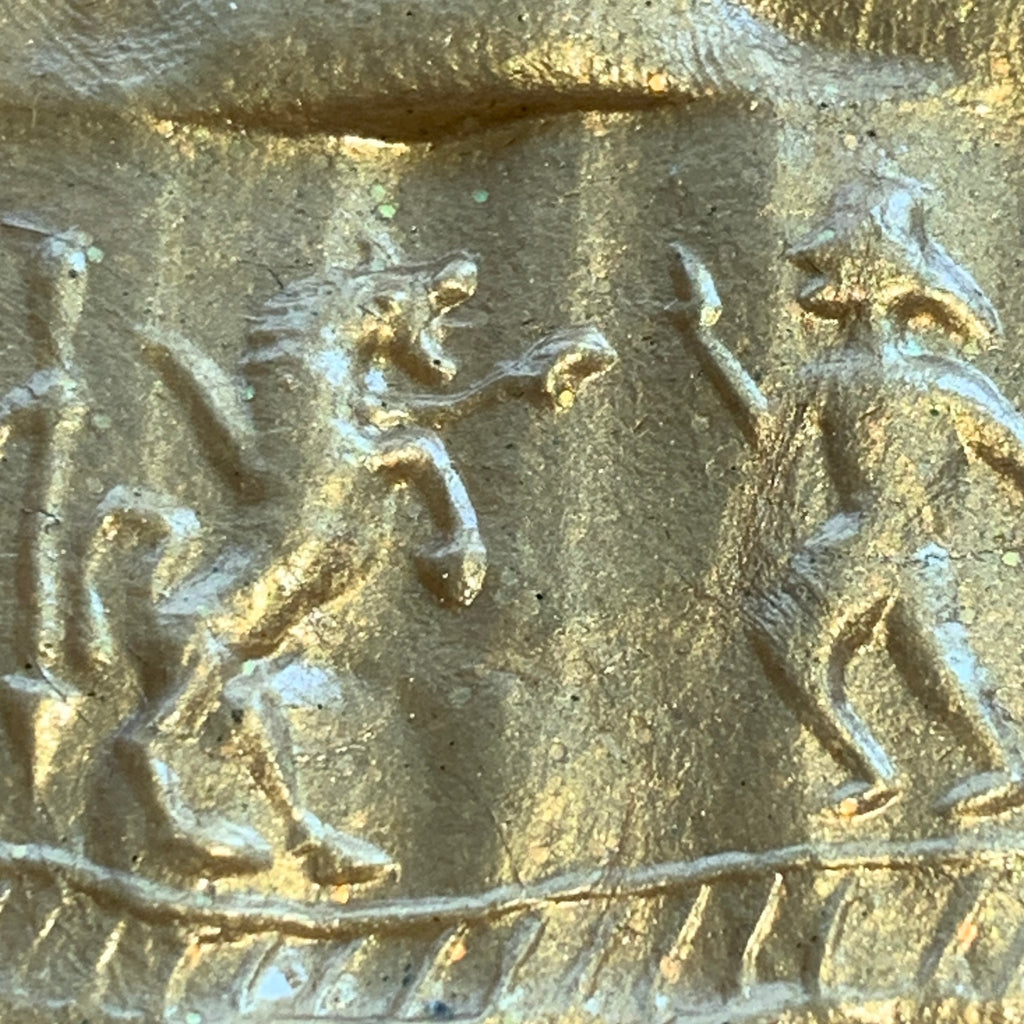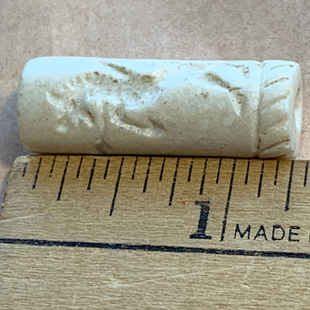This amazing bead looks like a plain white stone bead until you roll it in some silly putty or other impressionable material. Look at the amazing carvings! It tells a whole story, which I cannot decipher, but it is highly detailed carving with a man and a griffin. Sumerian, about 1,000 years old. 30mm long x 11mm diameter with 3mm hole. A collector item, and wearable! Found in present day Afghanistan.