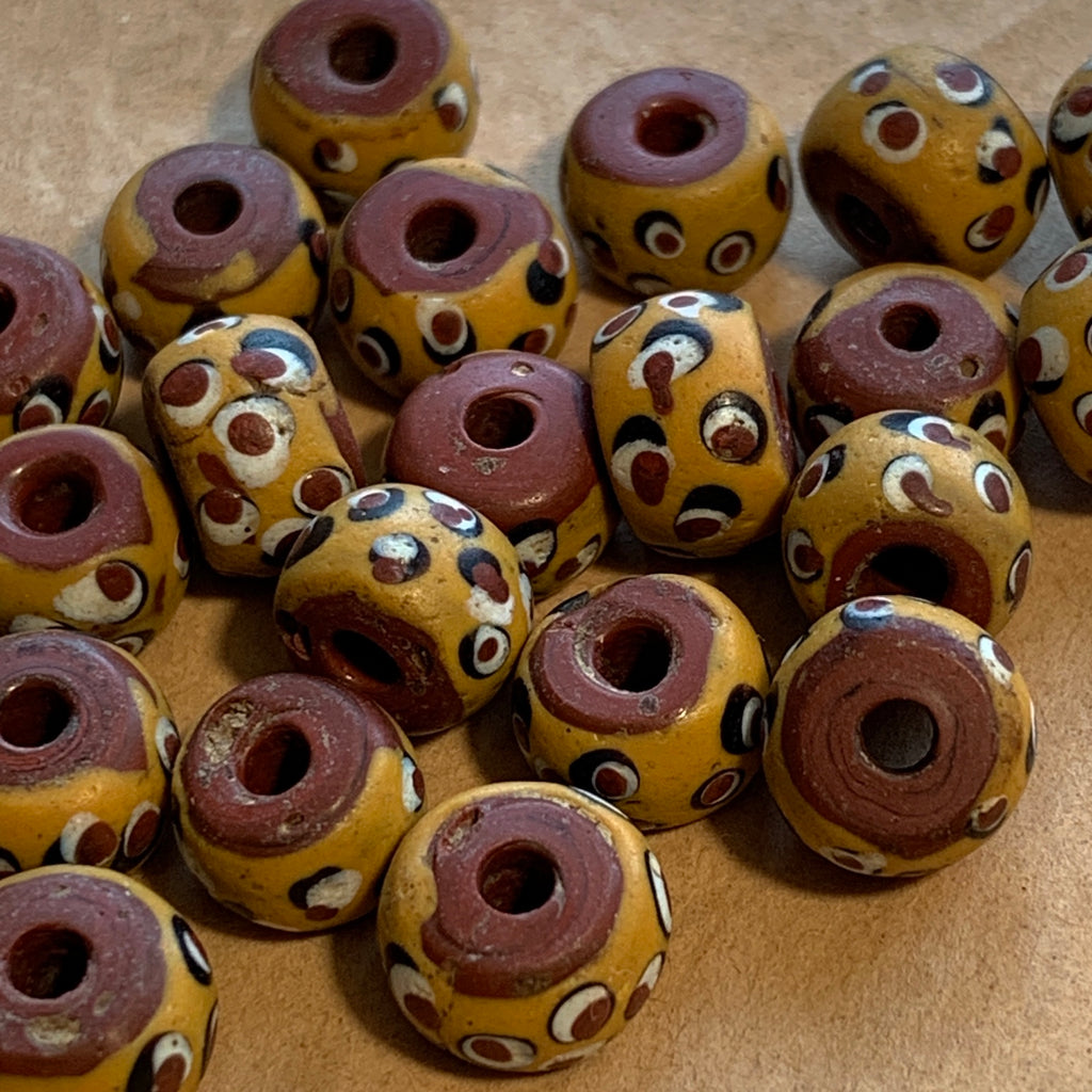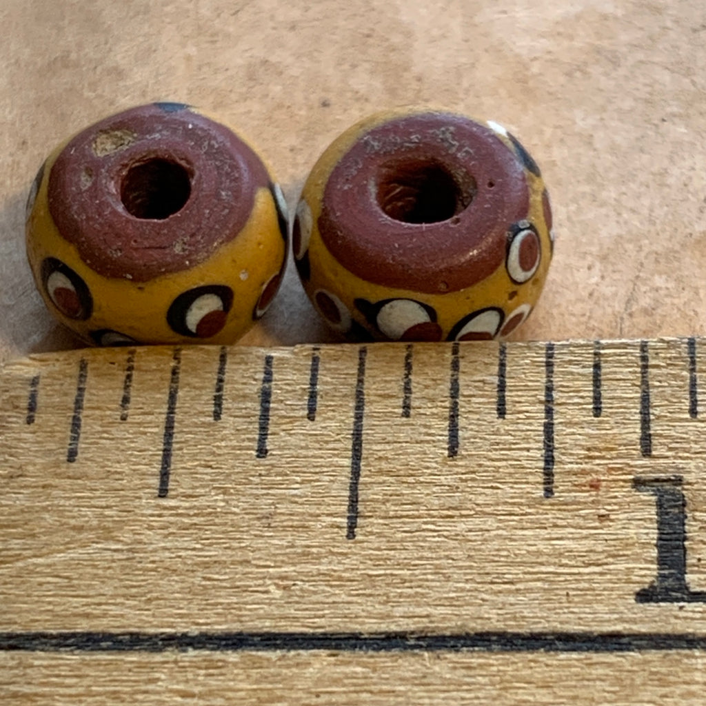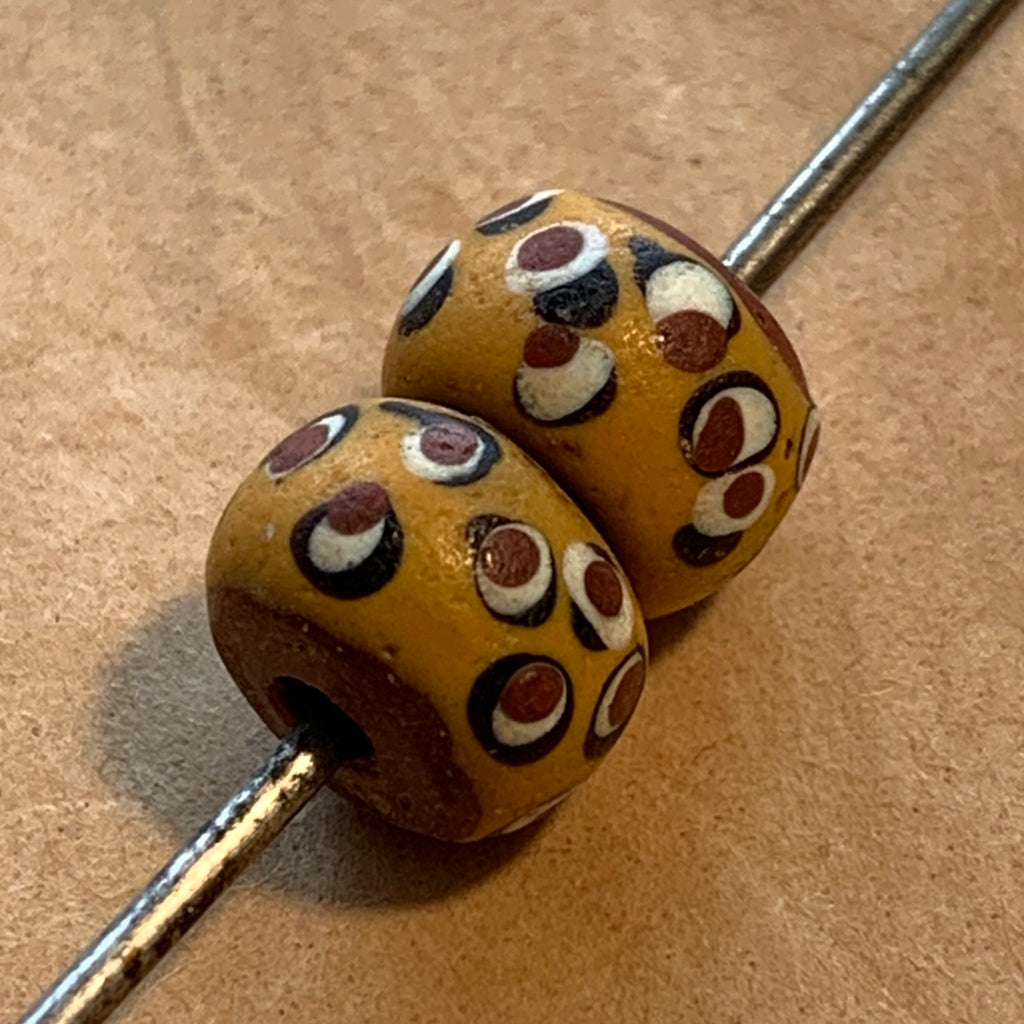 Very rare yellow and brown Venetian glass disc beads with eye patterns traded in Nigeria in the late 1800s. Wonderful design elements which Ruth uses in her line of jewelry! The size is 6mm thick x 9mm diameter with 2mm hole. Brick-brown core with yellow ocher, brown and white eyes. Very rare! Price is for 2 beads. Sold by the pair, perfect for earrings!