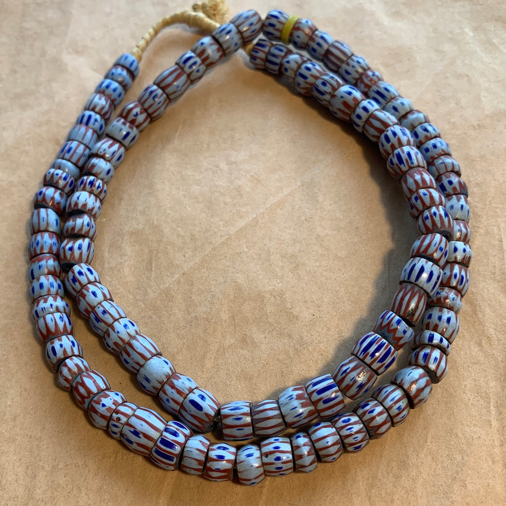24" strand of antique light blue with dark blue & brick-red stripes, "Anwally" glass beads. Venetian made in the late 1800's, a chevron-style bead. This strand has disc and barrel shapes, 8-9mm diameter, 2mm hole for stringing. In excellent shape!