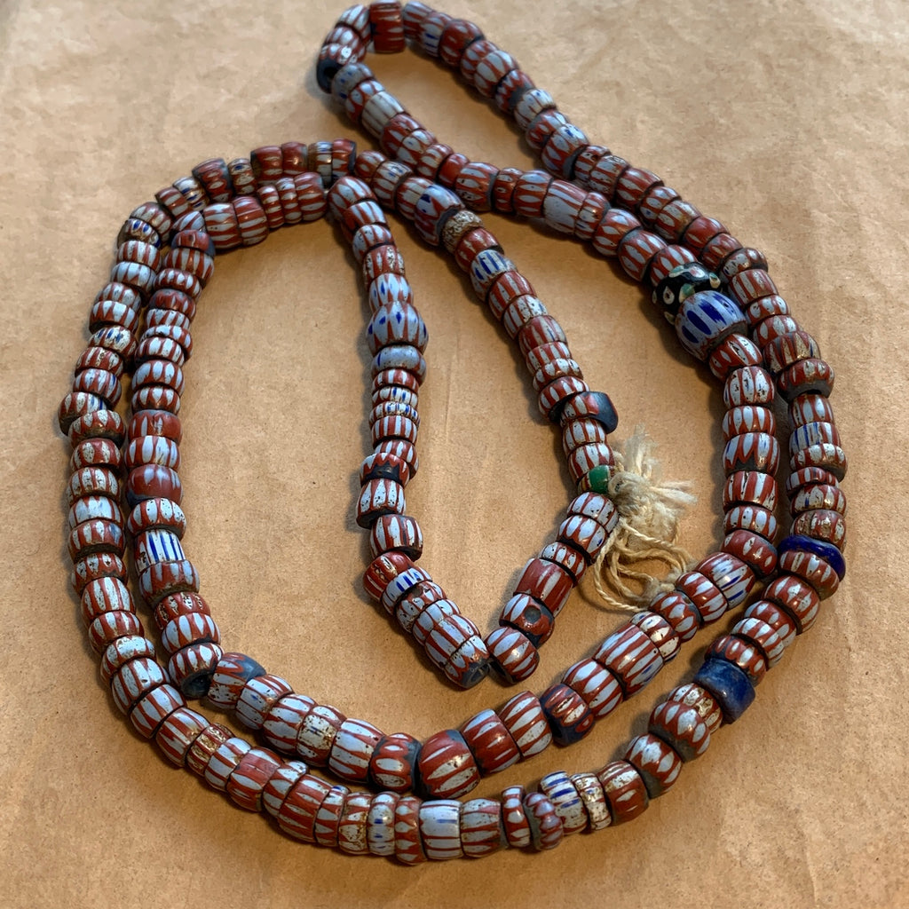 30" strand of antique light blue with dark blue & brick-red stripes, "Anwally" glass beads. Venetian made in the late 1800's, a chevron-style bead. This strand has mostly disc shapes with a few barrel shapes, average size is 7mm diameter, 2mm hole for stringing. In excellent shape!