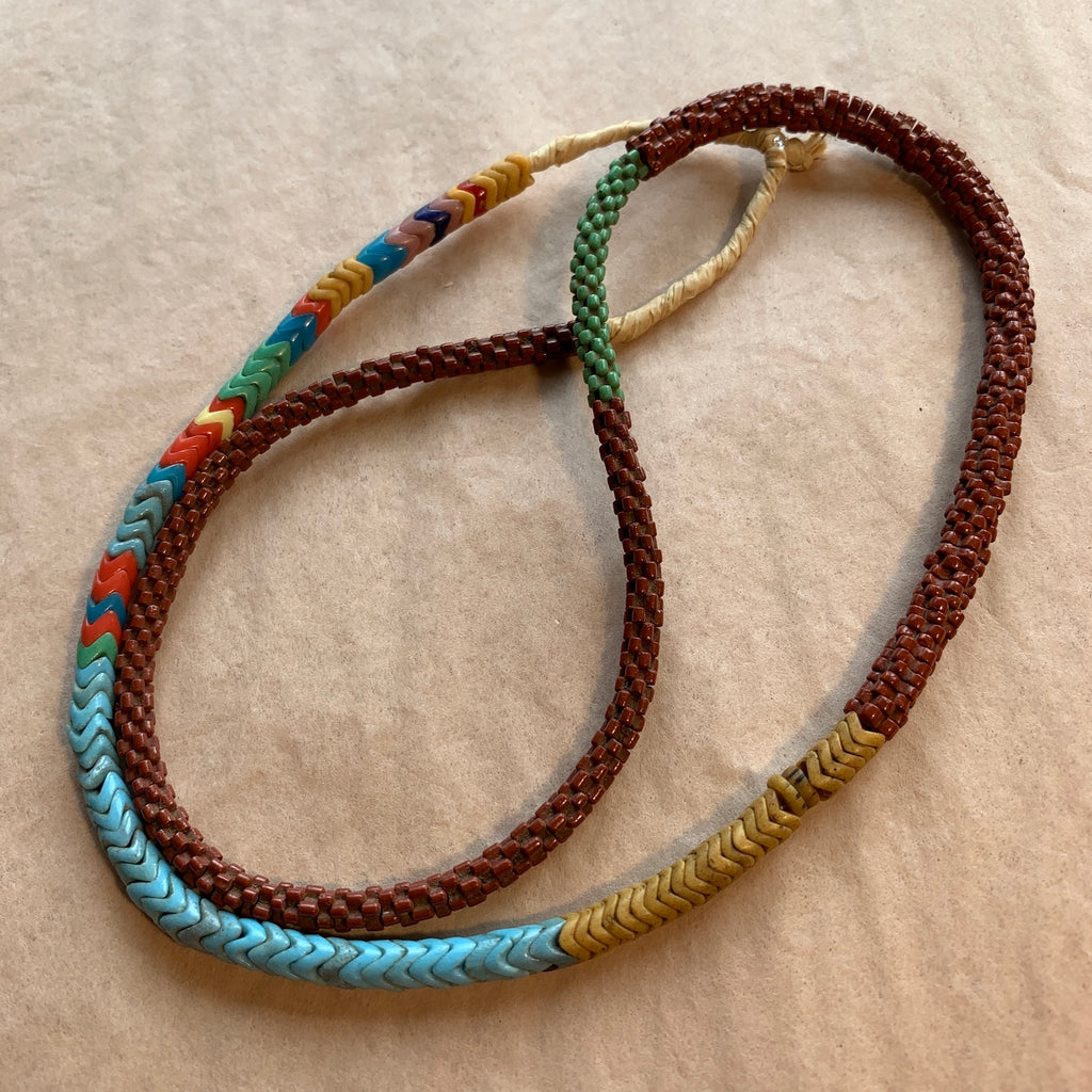 A great blend of colors, with a variety of shapes & Colors mixed in. 6mm Snake beads, 5 & 7mm flat flowers in brown and green opaque glass. Oranges, reds, greens, yellow, blue and brown color blend. These beads were popular with the Fulani Tribe of West Africa. Produced in the 1920's and 30's in Czech Republic. A one of a kind strand.