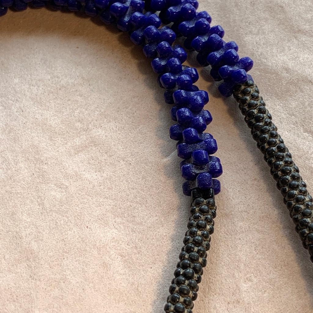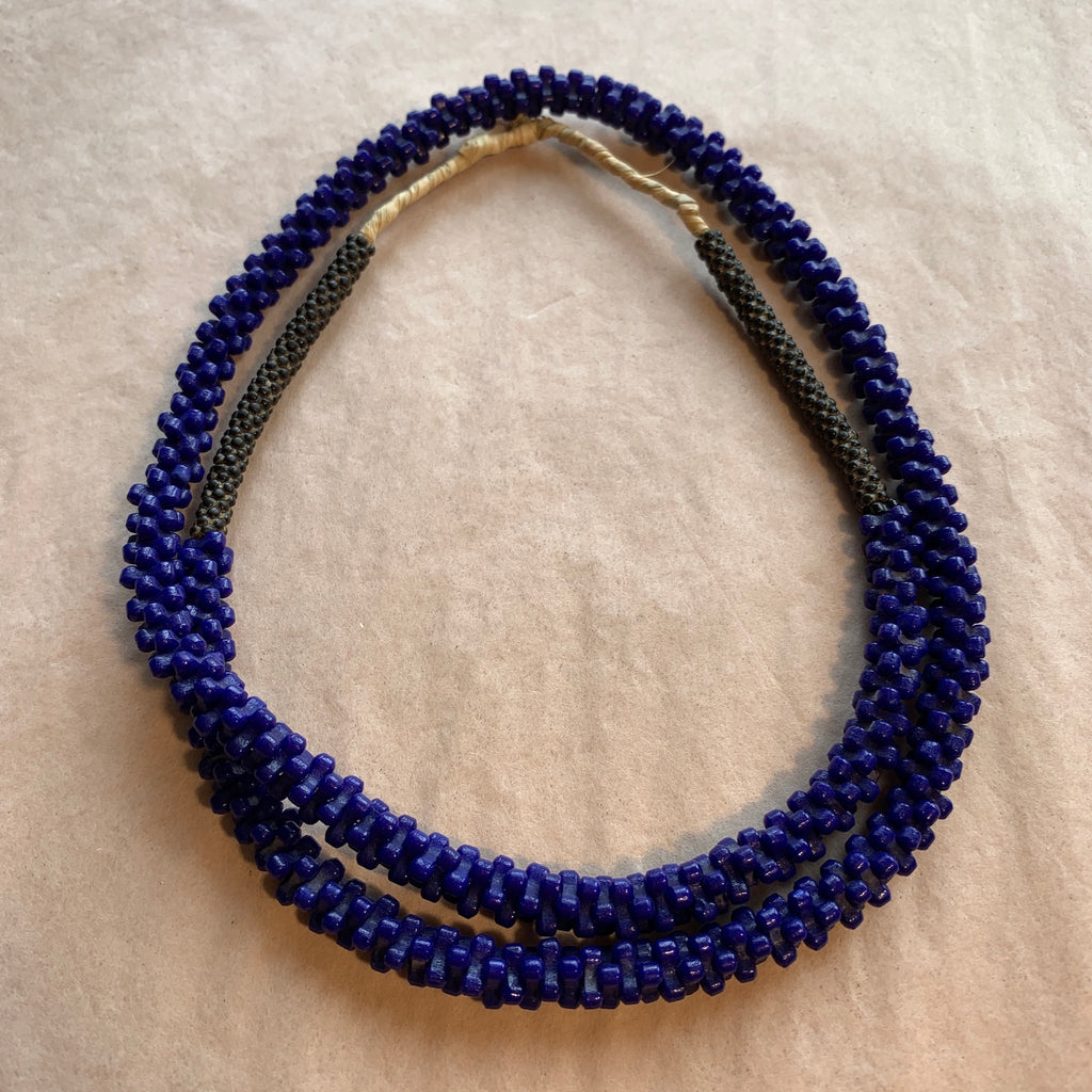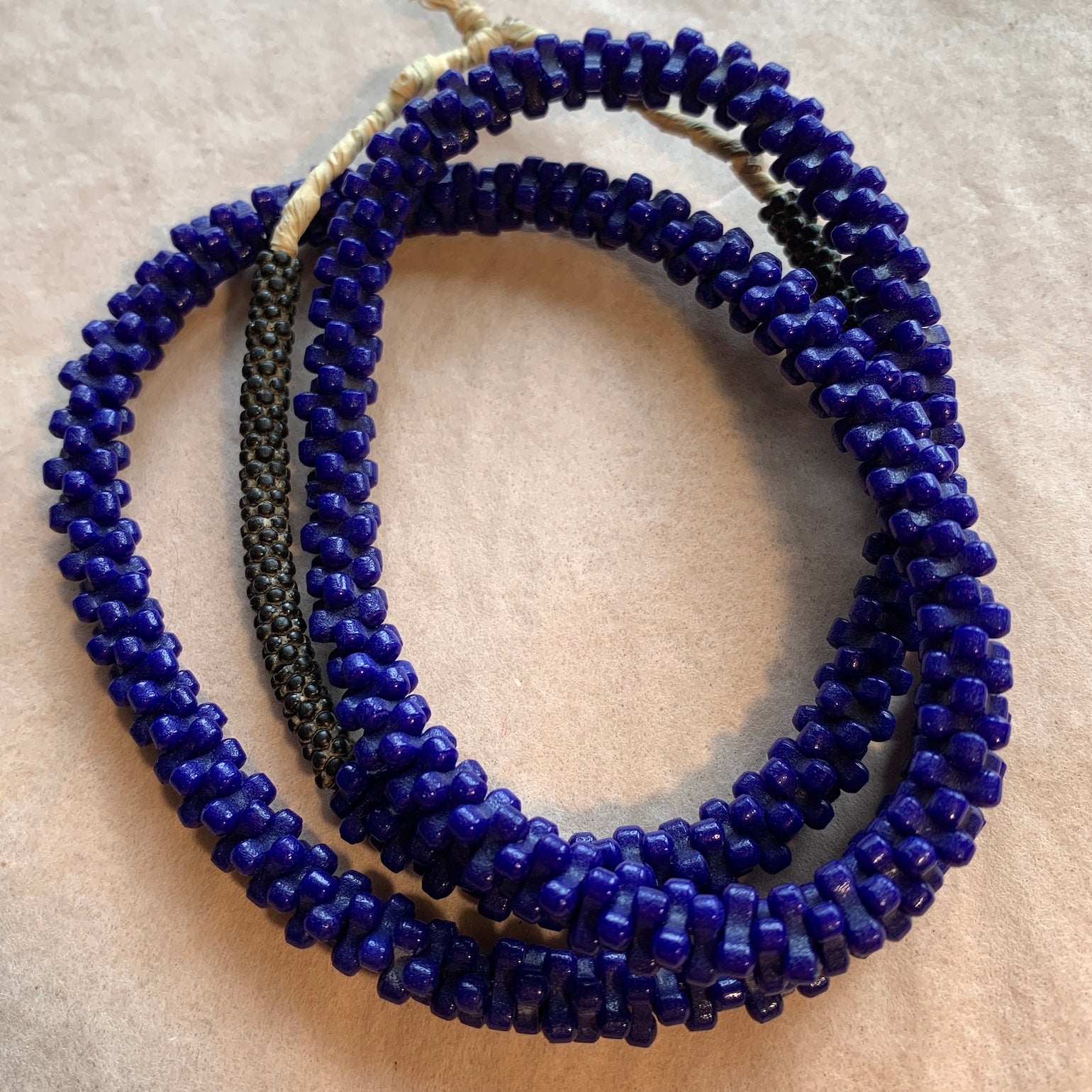 26" strand of old Czech-made 1930's pressed glass beads, bright opaque blue tri-beads and some smaller black 5-petal flowers at the top. 8mm diameter blue tri-beads, 3-pointed spacers., a wonderful strand of African Trade Beads! This shape is rare!