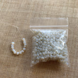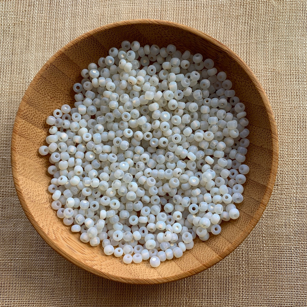 20 grams of vintage Venetian seed beads. 7° transparent moonstone color, matte. Beautiful subtle color designs well with old brass or silver. Old stock from early 1900's found in a warehouse! There is a slight opal-glass effect, and some holes are blocked, but can be reamed with an awl. These are "unfinished".