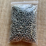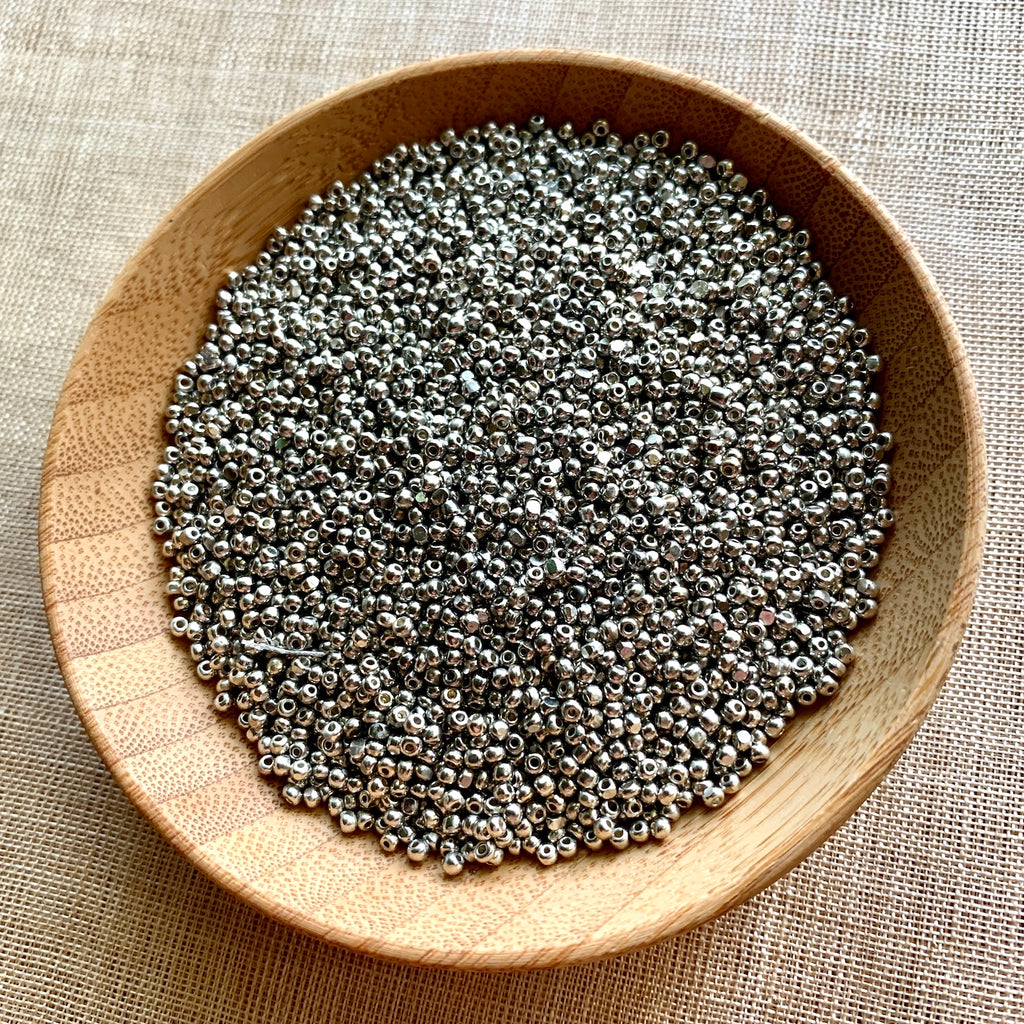 Vintage 11º Charlotte-cut antique silver plated glass seed beads, Czech-made 1980's. Loose, not in a hank, packed in a 11/2" x 2" ziplock bag. larger size, antique silver metallic color, resembling steel-cuts! Beautiful!! Charlottes have one single facet or flat spot on each rocaille, a subtle sparkle effect. Traditionally used in Native American on & off-loom weaving, particularly peyote stitch.