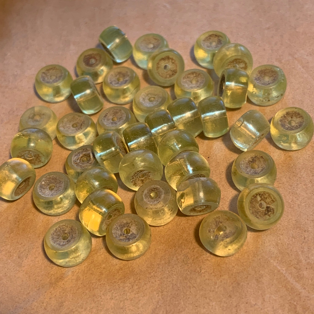 These Bohemia vaseline glass beads were made in the late 1800's and traded in Mali. A bright "greasy" jonquil color, semi-matte finish, uranium glass, fluoresce in blacklight.  These are rare now. 10 beads, 9mm diameter x 6mm tall, round discs with dip at 1mm hole so round bead fits nicely! These beads are a great earring or spacer bead, a staple!