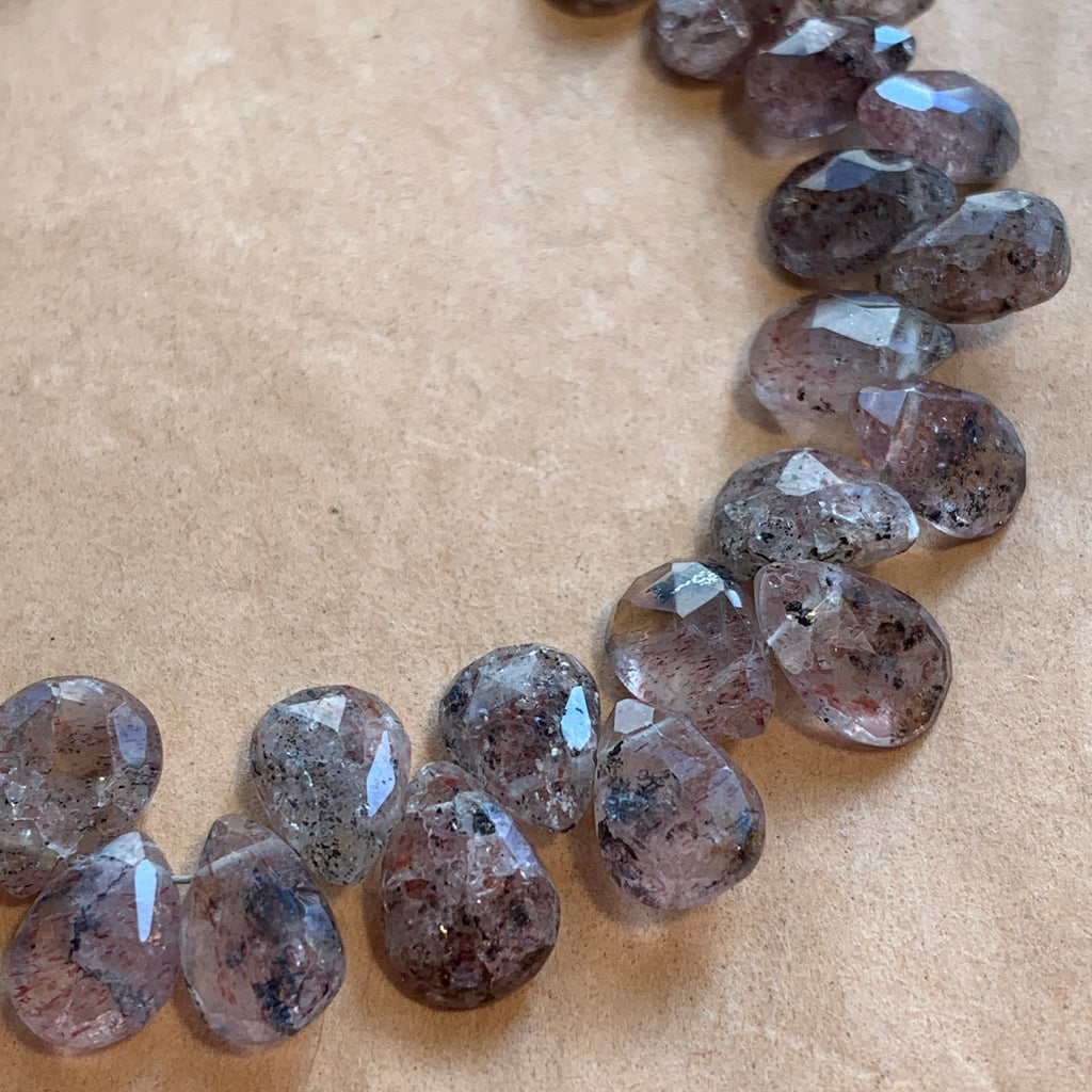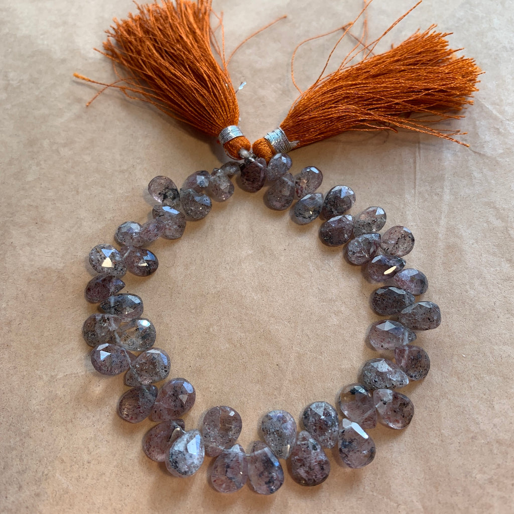 7 inch strand of good quality amethyst-rutile quartz, (Amethyst needle-like crystals within quartz) pear-shape briolettes, fine faceting and drilled across the point, so beads hang as a charm or pendant. 46 beads per strand. Size is graduated, from 8-10mm tall x 5-7mm wide x 3.5mm thick. Small .4mm hole. Lovely mottled purple briolettes.