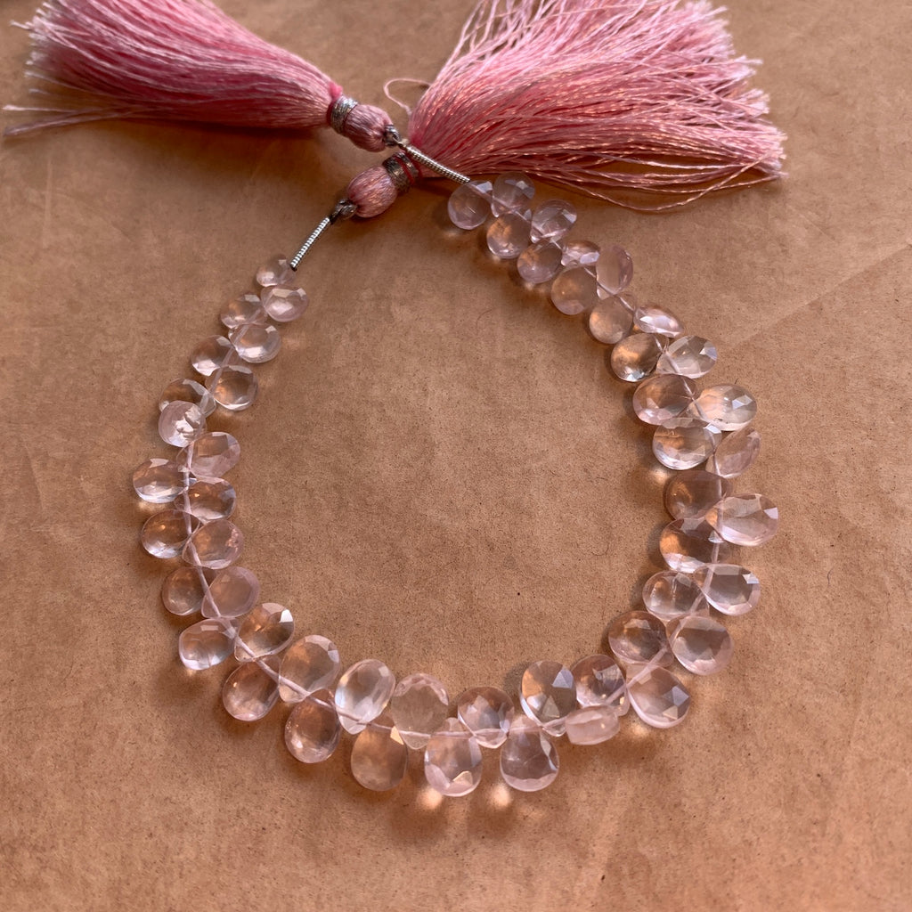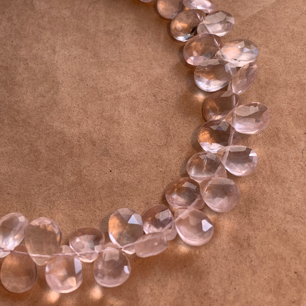 7 inch strand of rose quartz pear-shape briolettes, fine faceting and drilled across the point, so beads hang as a charm or pendant. 53 beads per strand. Size is slightly graduated, from 7-8mm tall x 5-6mm wide x 3.5mm thick. Small .4mm hole. Lovely light transparent pink.
