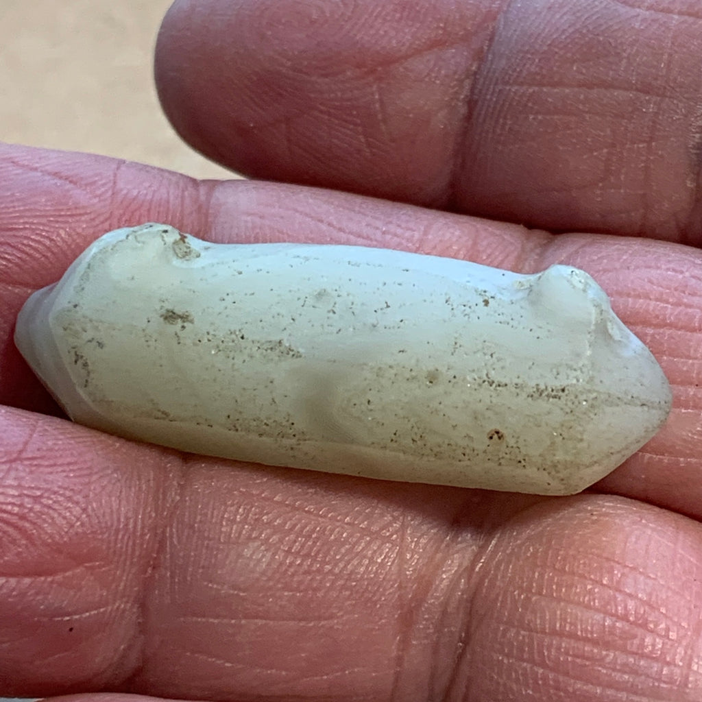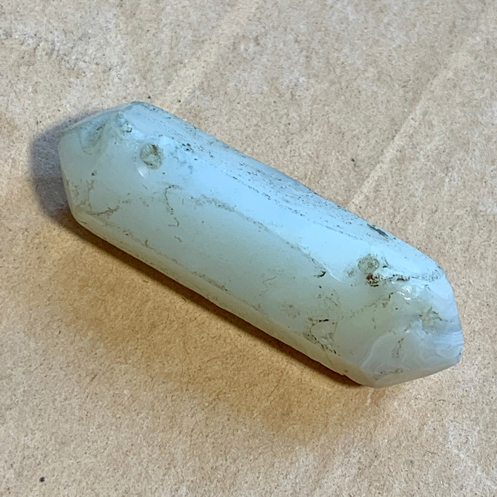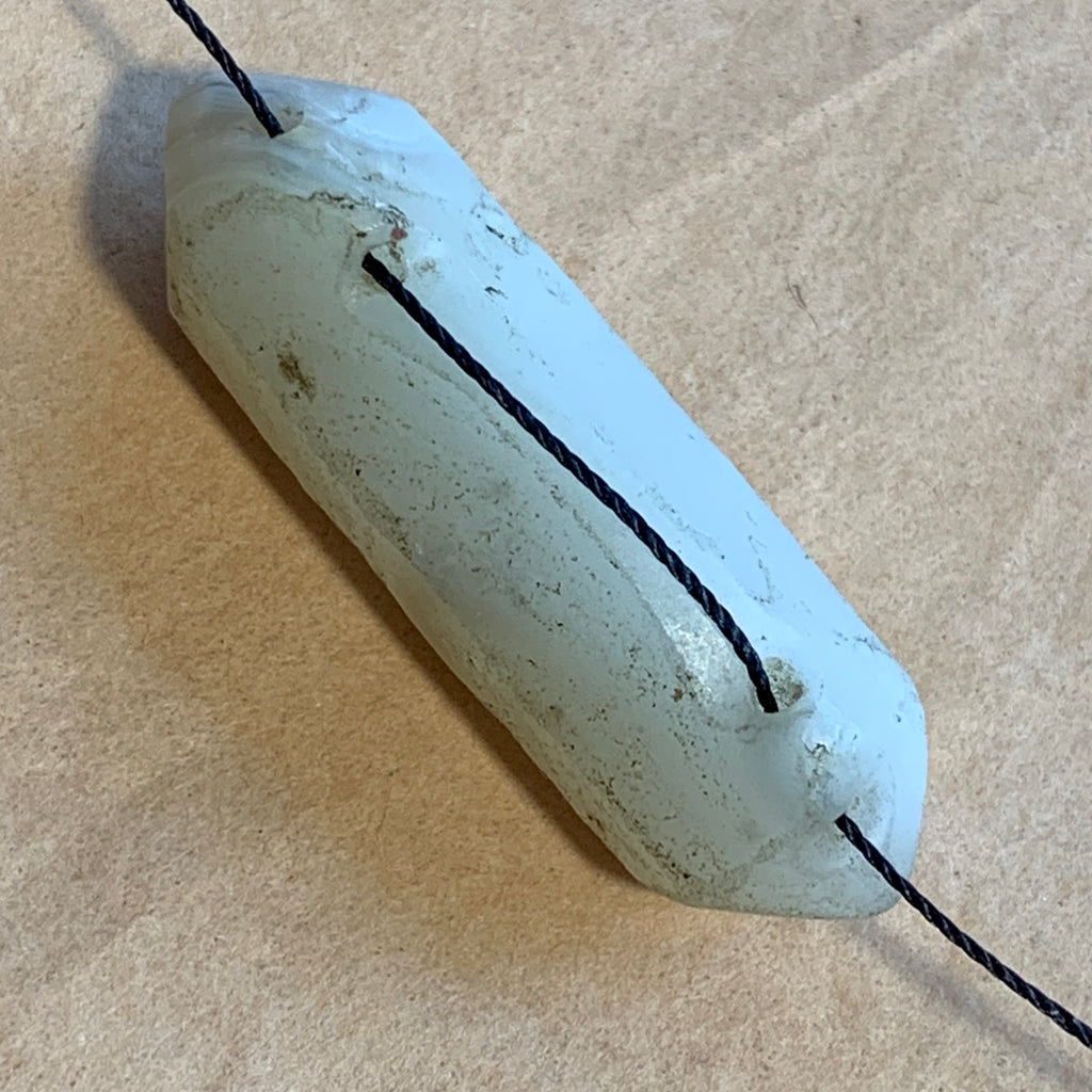 Natural agate pendant, hand carved in Northern India, about 1,000 years old! Stone is translucent beige with a bit of banding. This bead has beautiful natural patterns and color, and is in excellent condition. 22mm tall x 28mm across x 5mm thick. There are two .5mm holes was drilled at an angle which meets. Rare, collectible and unique! Protective powers in a natural crystal shape.