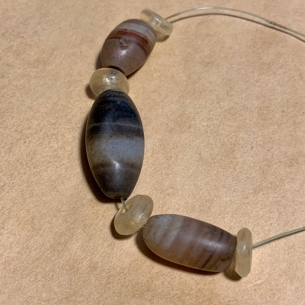 Beautiful and rare old agate beads with beautiful natural striation, matte finish. Strung and traded in West Africa. These are quite old, best guess 1800's, highly collectible with subtle colors. Center bead is 24mm long x 12mm diameter. Spaced with ancient quartz beads which were excavated in Mali, West Africa. 7 beads on this short strand. Truly one of a kind!