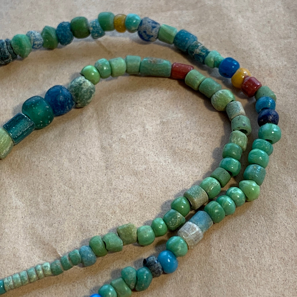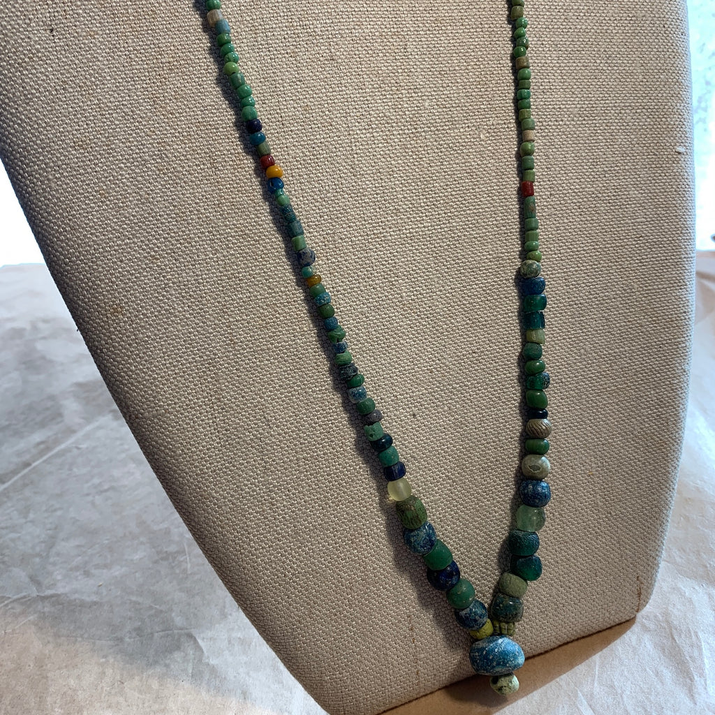 23" strand of ancient blue and green glass beads from Afghanistan. Created over 2,000 years ago during the Roman Period, these Afghan beads are a mixture of dark blues and various greens, a mix of shapes and textures, beautifully graduated. Size ranges from 2.5mm diameter- 14mm diameter largest bead at center. Fairly fragile beads, and so so rare, especially the wound green bugle beads at the top! These were traded along the Silk Road in ancient times, a treasure!