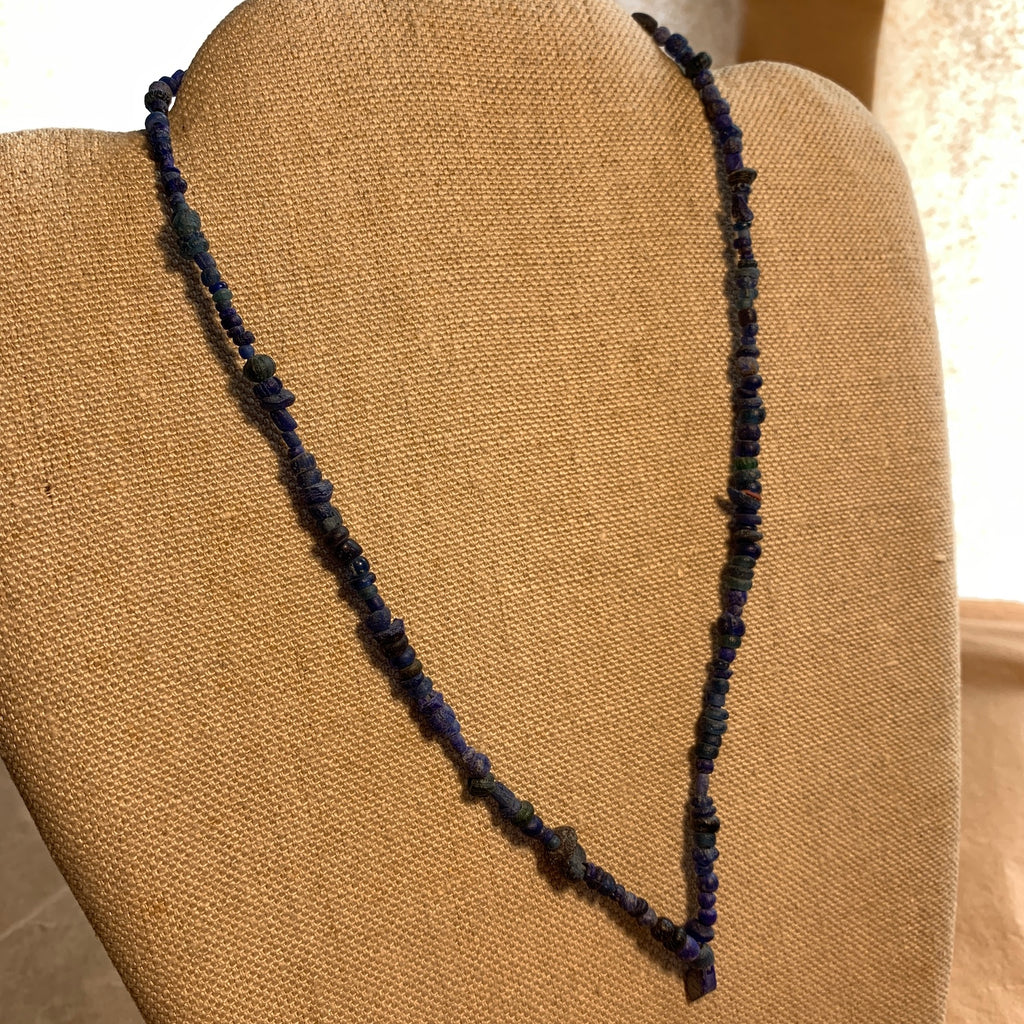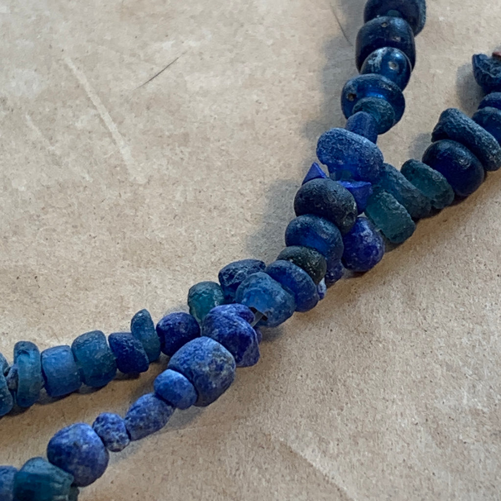 16" strand of ancient lapis lazuli and cobalt ancient glass beads from Afghanistan. Created over 2,000 years ago during the Roman Period, these Afghan beads are a mixture of dark blues, stone and glass, a mix of shapes, beautifully graduated. Size ranges from 4mm diameter- 5mm diameter. Fairly fragile beads, and so so rare!! These were traded along the Silk Road in ancient times, a treasure!