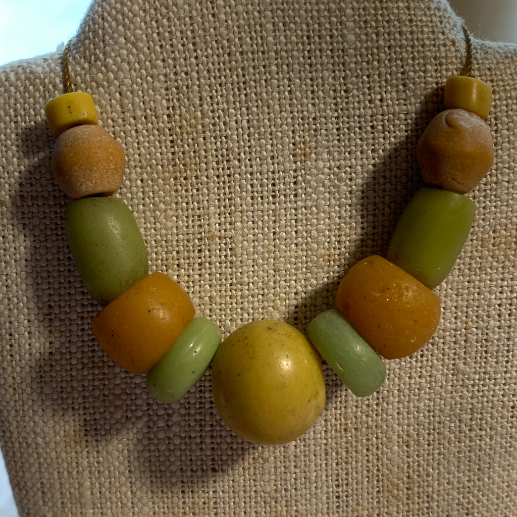 Antique Dutch opaque yellow & chartreuse glass bead mixed short strand. Made in the 1700's and traded in West Africa. Center bead is 17mm diameter with 3mm hole, lamp-wound. 4 opaque chartreuse glass beads in the mix. 11 beads on this short designed strand with varying hole sizes.