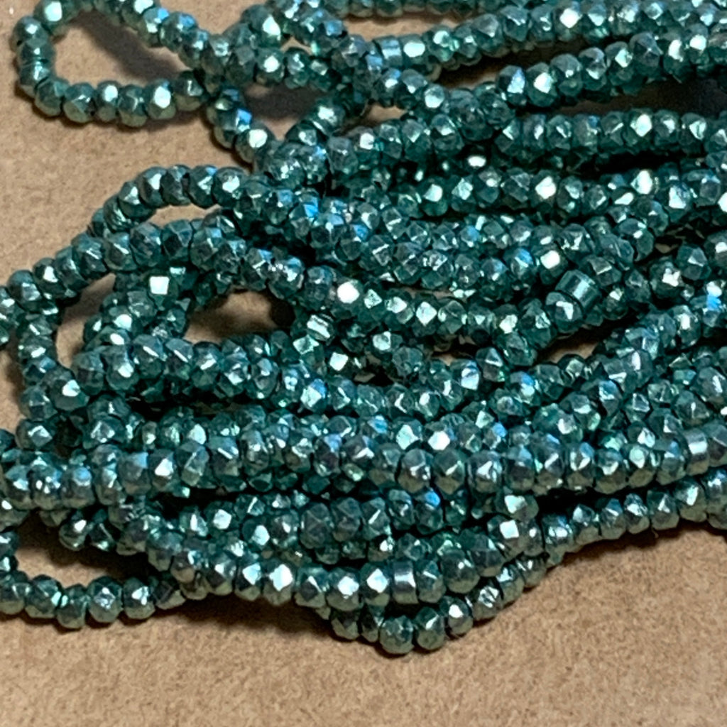 Hank of antique green-ish blue French steel cut beads, over 100 years old. Size P4– which is approximately 16º in seed bead size. Faceted 3-cuts, rare to find in original hanks! 12 4-inch strands, perfect detail beads, nice big 1mm hole, 1.4mm diameter. Last photo shows some new colors, some of which are listed on my Etsy site, and more solid hanks coming soon!