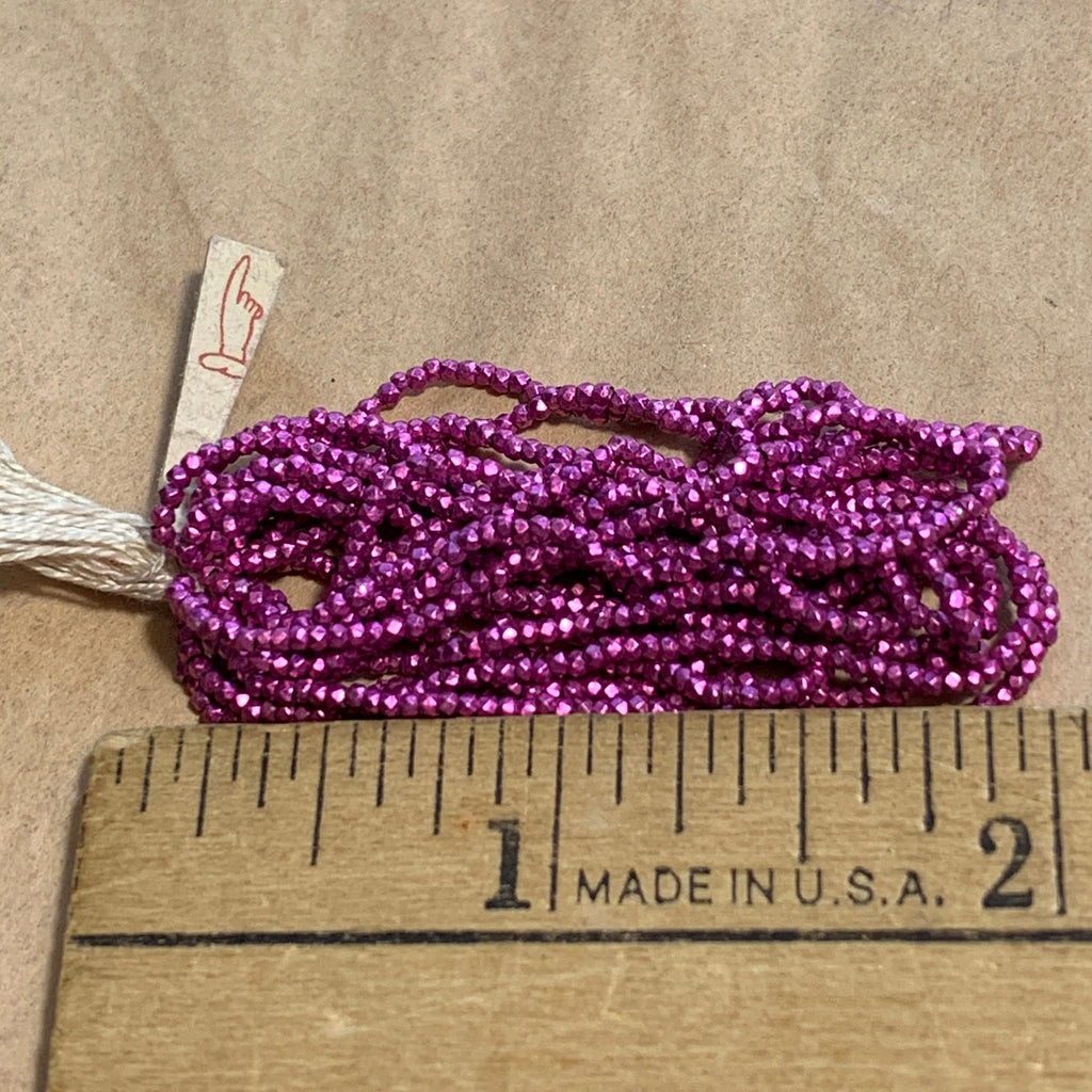 Hank of antique magenta French steel cut beads, over 100 years old. Size P5 – which is approximately 15º in seed bead size. Faceted 3-cuts, rare to find in original hanks! 12 4-inch strands, perfect detail beads, nice big 1mm hole, 1.4mm diameter. Last photo shows some new colors, some of which are listed on my Etsy site, and more solid hanks coming soon!