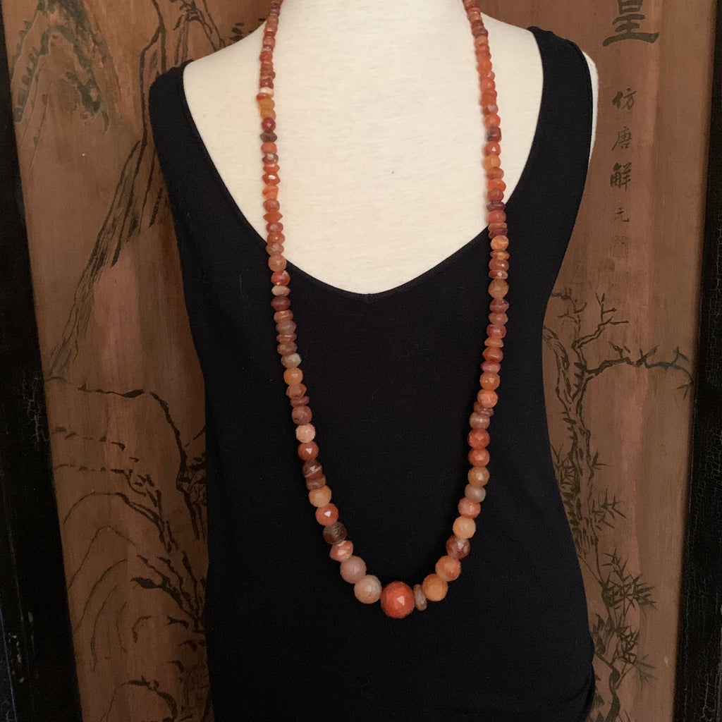 Antique & ancient carnelian agate beads, super-long graduated 44 inch strand, hand-carved in India & Mali, West Africa. Goldfish oranges and darker carnelian orange & browns, mixed shapes, not uniform. One rare dark amber-color bead. 7-25mm in diameter. Small discs, Carved bicones, faceted rounds (not ancient). A show-stopper strand!!