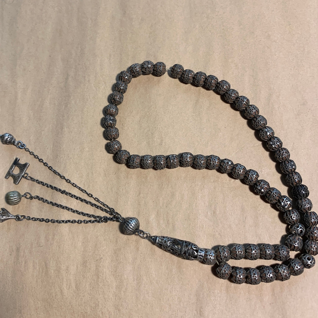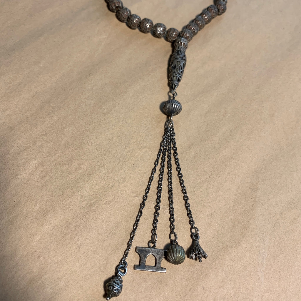 Lovely filigreed prayer beads with encased olivewood beads from Yemen, early 1900's. 7mm diameter beads with 1mm holes, needs restringing for use. 56 beads, not including the counter beads and tassel beads. The tassel has 4 chained charms hanging from a beautiful silver bead. This is a very traditional islamic prayer strand, very special, from my personal collection!