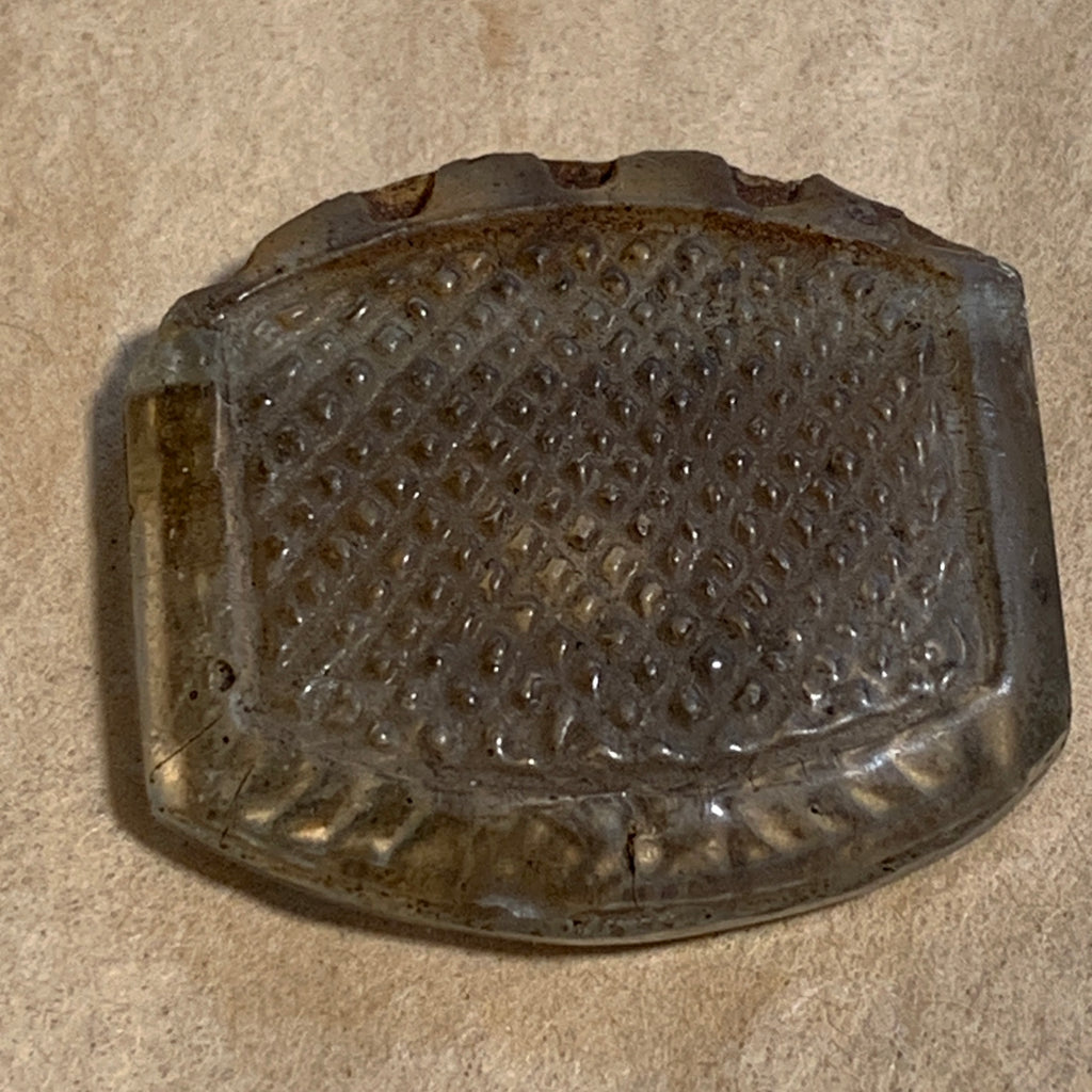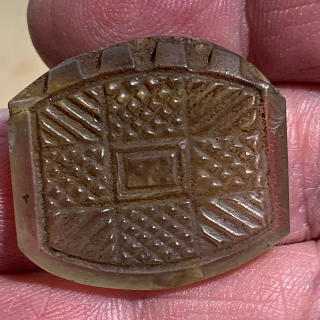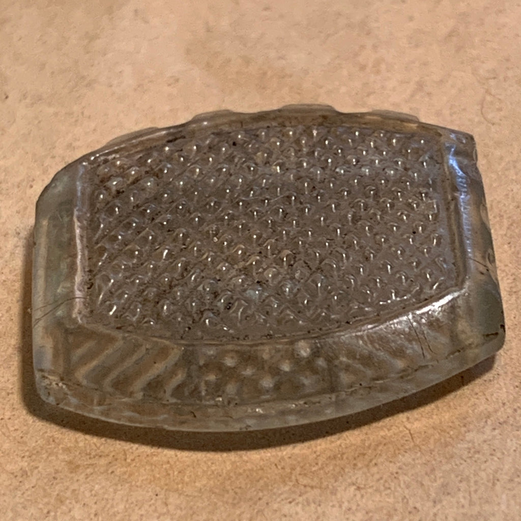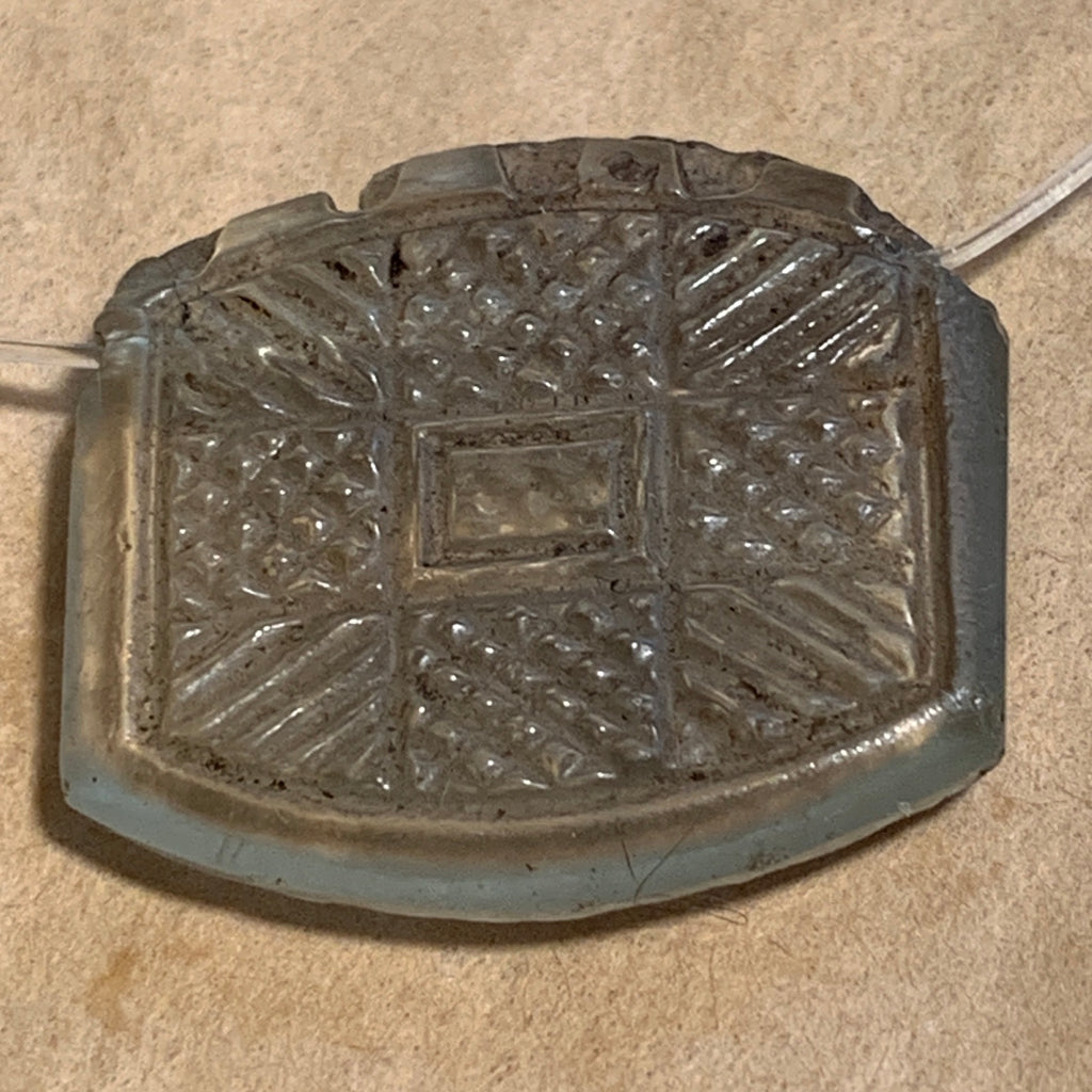 These pendants are so unusual, textured 2-sided, 2 patterns in clear glass with grey-ish appearance, scalloped edge on top, made in the Czech Republic in the early 1900's, and traded in Mali. Wonderful design element! 27mm wide x 24mm wide x 5mm thick. First time I've seen this pendant in 40 years! Small 1mm hole runs horizontally across the top. Sold individually, price is for one pendant.