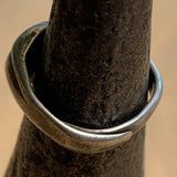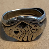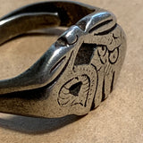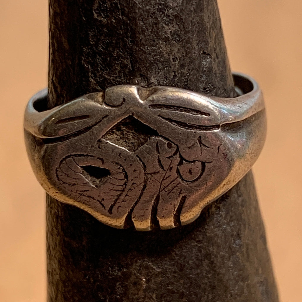 This flat-top ring is made of coin silver, simple engraved design with hand and heart, unsoldered adjustable size band. This ring has a wonderful patina, quite shiny, smooth from wear. 11mm width, early 1900's. Very comfortable to wear and is size 6, but can be adjusted.