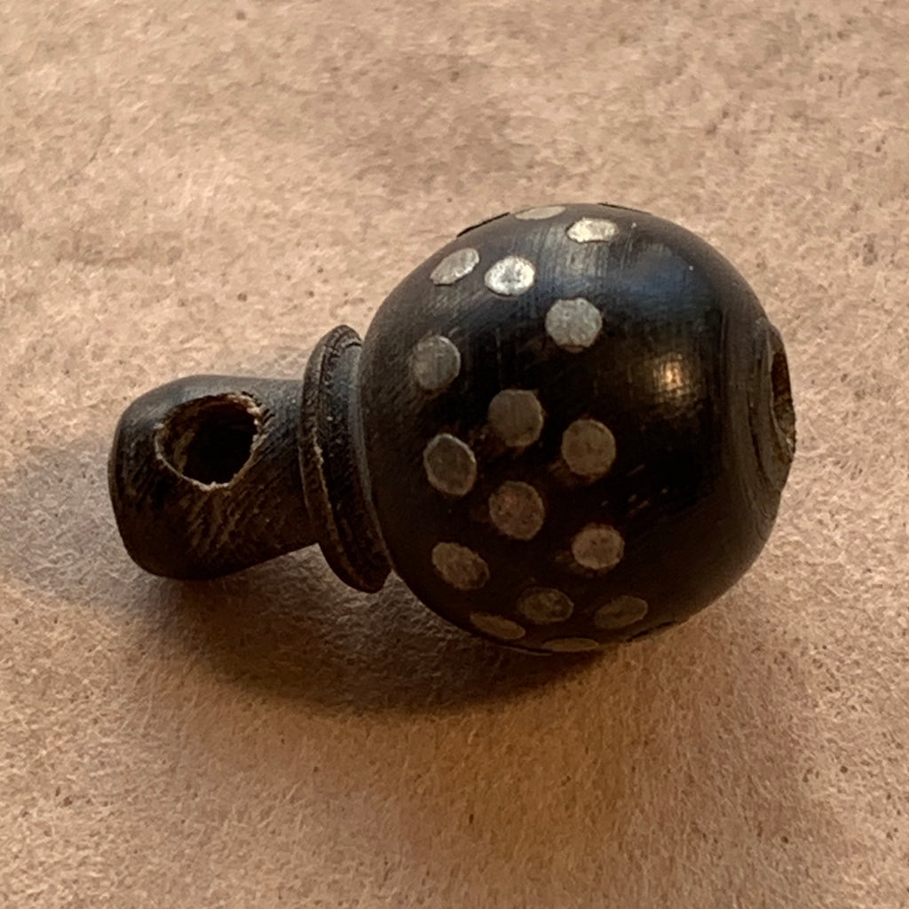Black coral prayer beads with silver inlaid dots are considered protective. Excellent quality, these tassel beads are in perfect condition! None of the small silver nailhead inlay are missing, these are over 100 years! Sold individually, price is for one fabulous bead. 2mm hole, beads are approximately 12mm diameter x 19mm length.