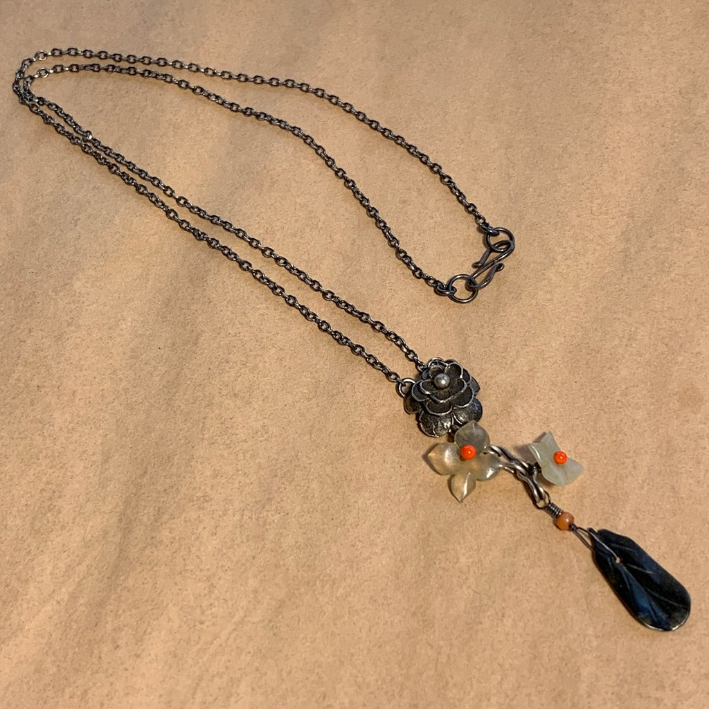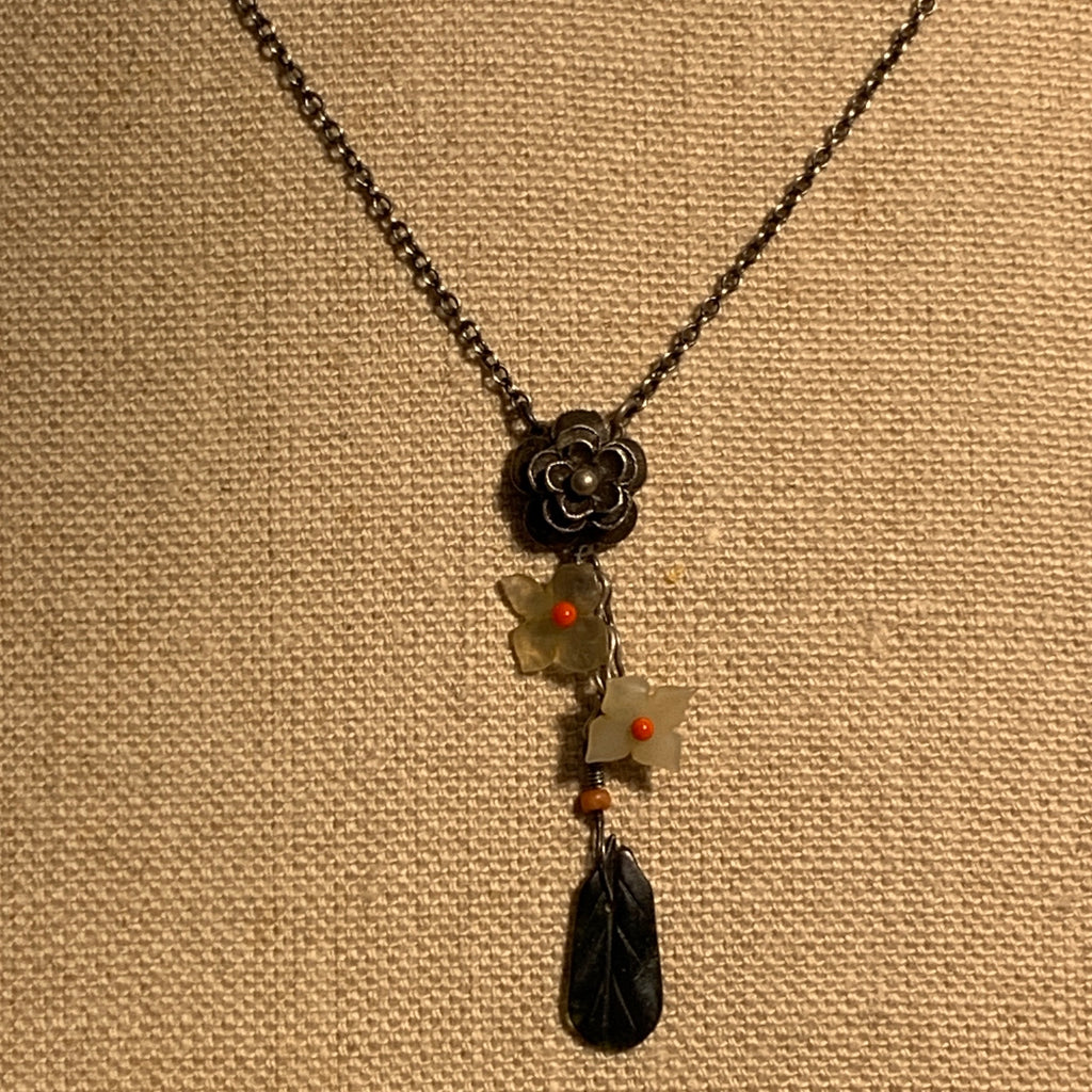 This 18 inch long necklace centers an exceptional silver flower pendant with antique jade carved flowers and leaf. Hand-carved Chinese charms are about 100 years old! Securely connected onto an oxidized sterling silver chain with S-hook closure. Designed and handmade by Ruth, simple and elegant.