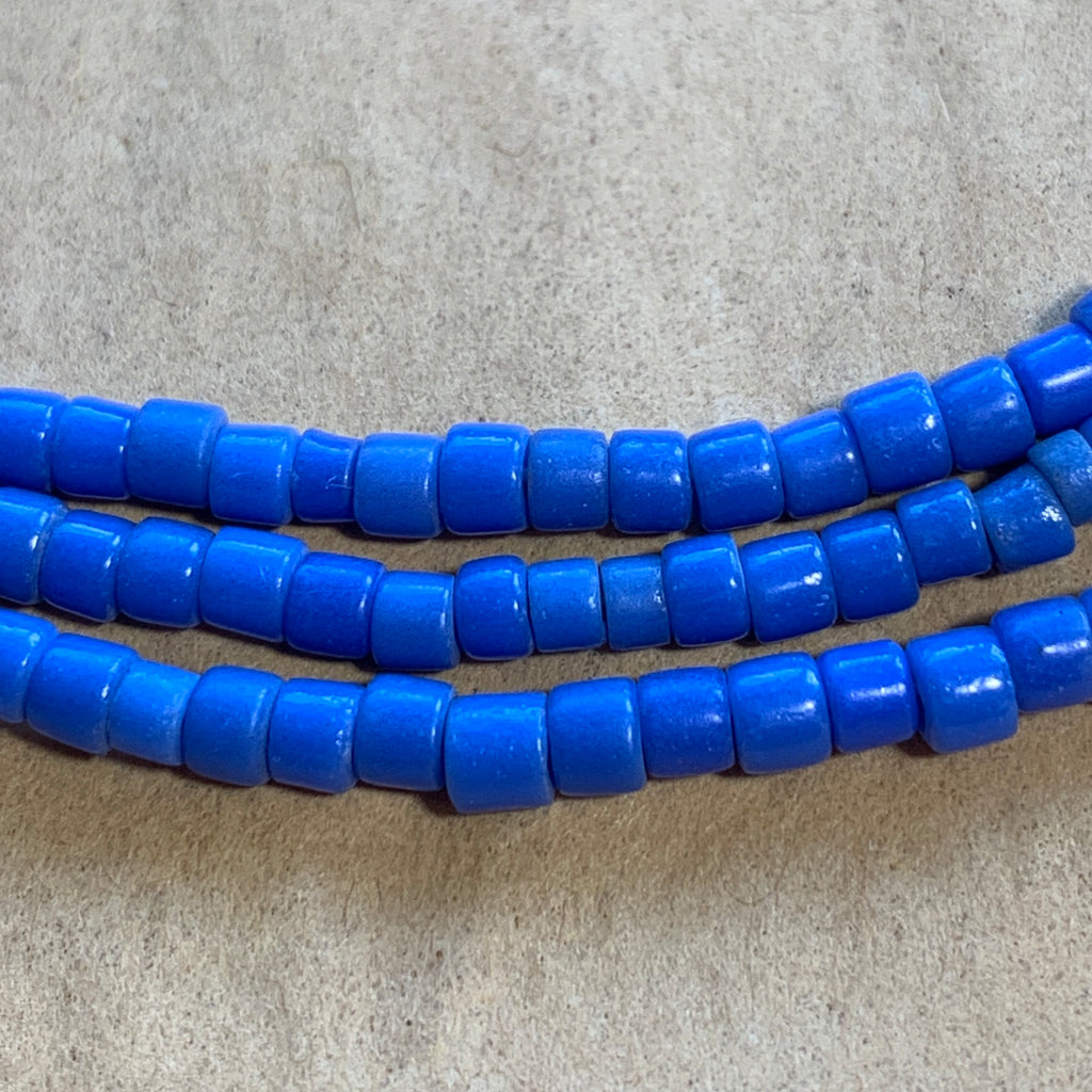 Short cylindrical Venetian-made opaque dark cornflower blue tile beads, approximately 3mm x 3mm, early 1900's, 24" long strand, 1.2mm holes. Now quite rare! These beads are in excellent condition!