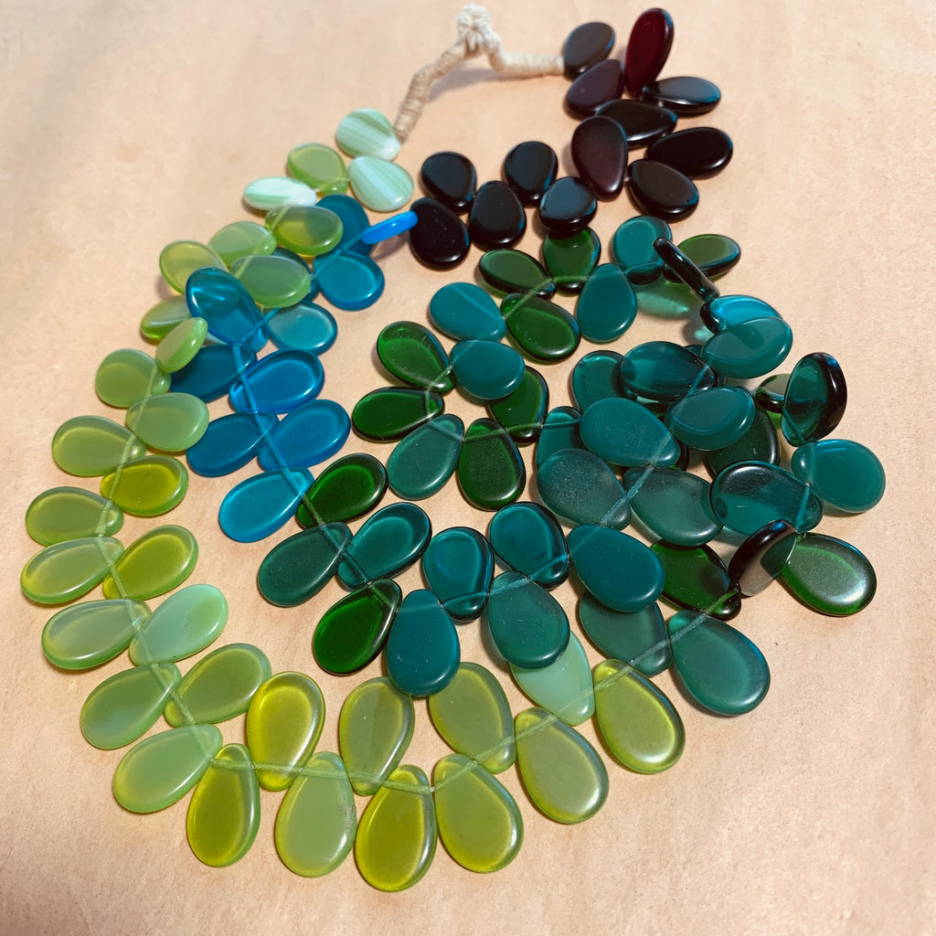 Czech pressed glass wedding beads, traded in Mali, West Africa. African trade beads 1940's -50's, 26" strand of 100 colorful flat teardrop briolettes in very good condition. Beads are consistant in size measuring 12mm wide x 18mm tall x 3.5mm thick. Wonderful earring components and stringing possibilities! Aqua blue, dark and spring greens, dark ruby red glass, such beautiful colors!!