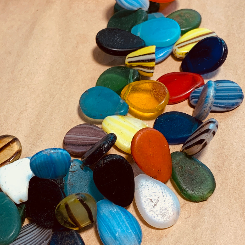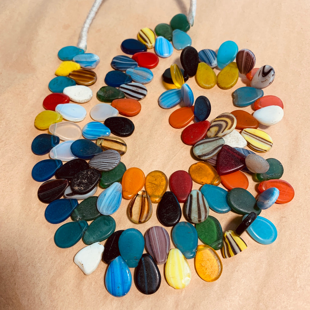 Czech pressed glass wedding beads, traded in Mali, West Africa. African trade beads 1940's -50's, 26" strand of 94 colorful flat teardrop briolettes with most in very good condition, 5 broken beads. Beads are consistant in size measuring 12mm wide x 18mm tall x 3.5mm thick. Wonderful earring components and stringing possibilities!