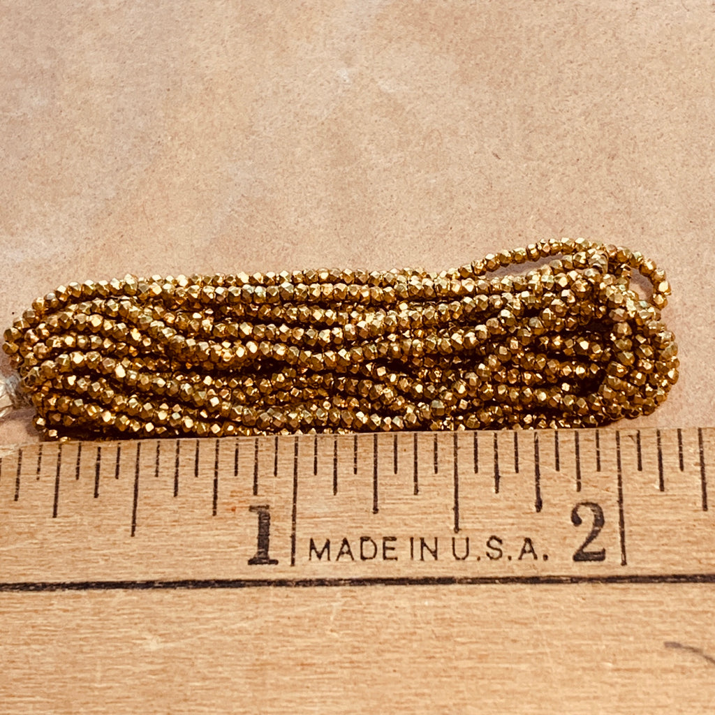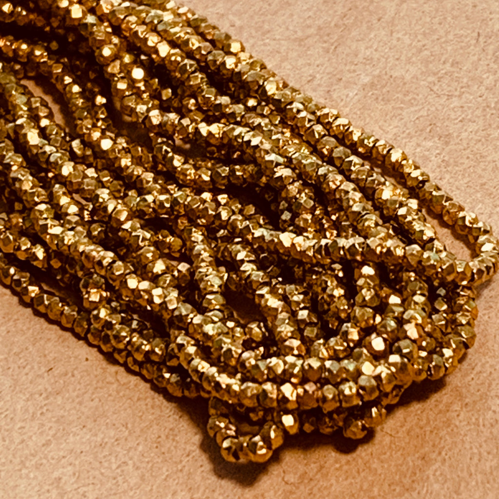 Hank of antique gold French steel cut beads, over 100 years old. Size P5 – which is approximately 15º in seed bead size. Faceted 3-cuts, rare to find in original hanks! 12 4-inch strands, perfect detail beads, nice big 1mm hole, 1.4mm diameter. Last photo shows some new colors, some of which are listed on my Etsy site, and more hanks coming soon!