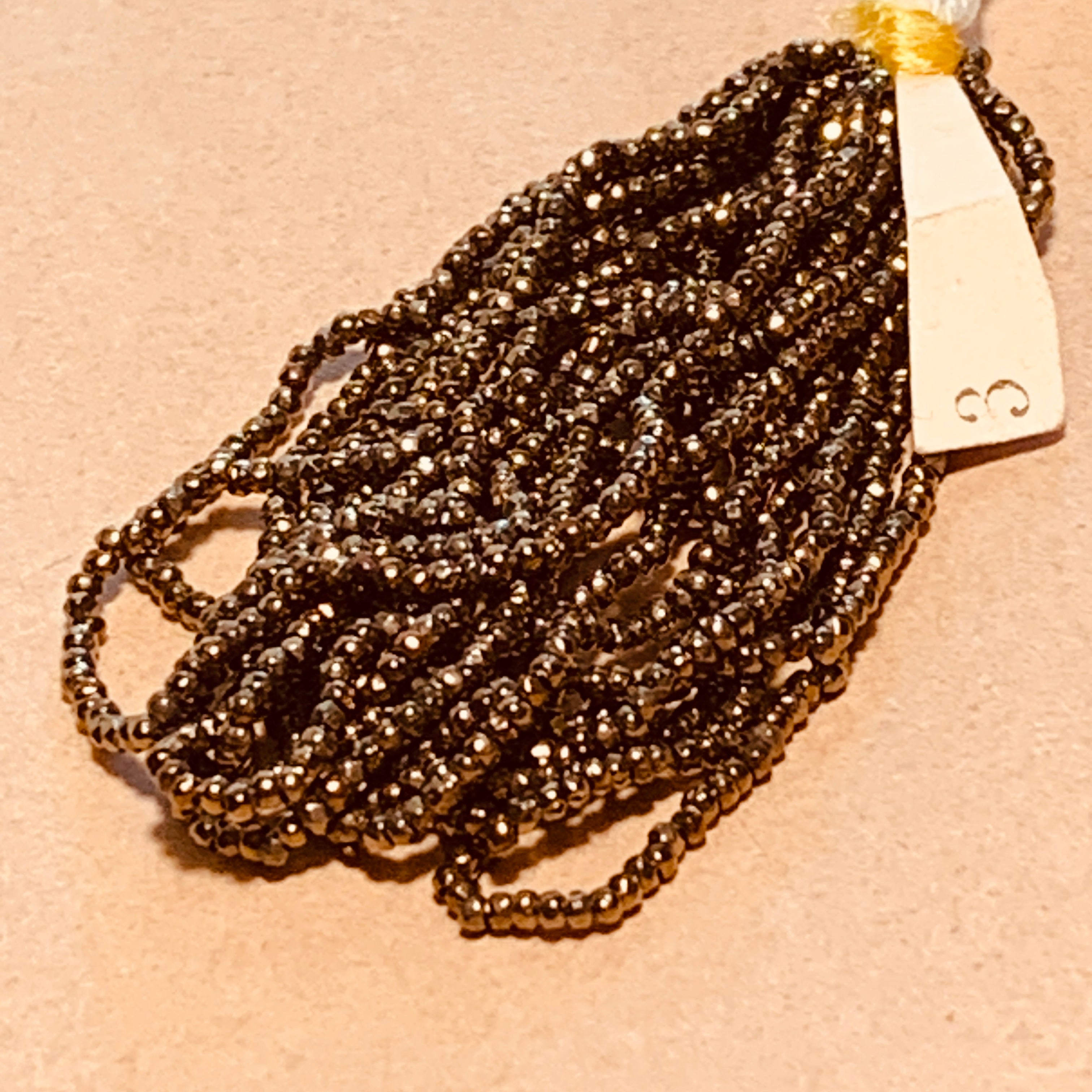 Hank of beautiful bronze French steel cut beads, over 100 years old. Size P3 – which is approximately 18º in seed bead size. Faceted 3-cuts, rare to find in original hanks! 12 3-inch strands, perfect detail beads, nice big hole, 1mm diameter. Last photo shows some new colors, some of which are listed on my Etsy site, and more hanks coming soon!