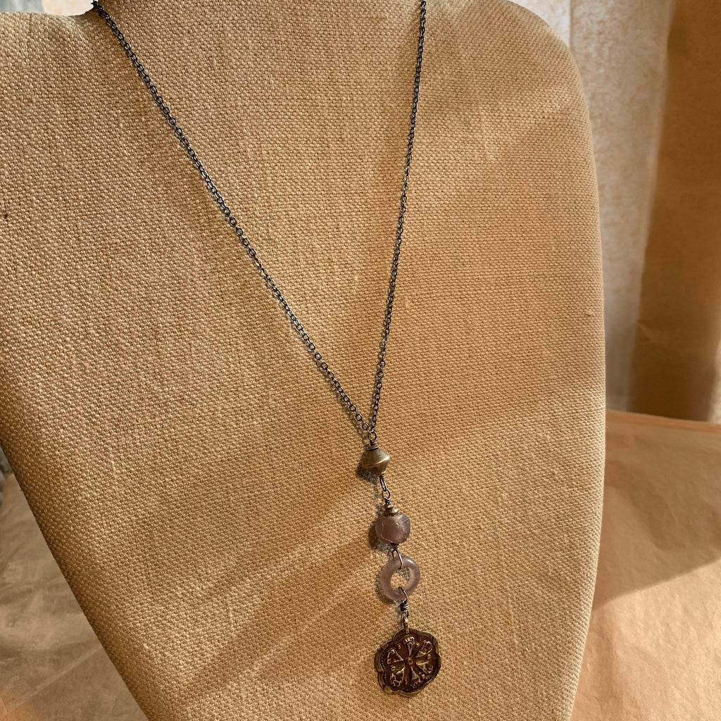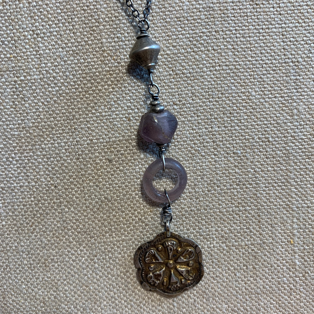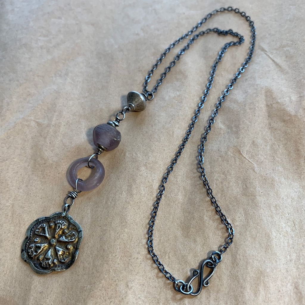 Antique silver goddess charm from India with 2 rare purple Dogon glass beads, and Ethiopian silver hanging from a 16 inch long oxidized sterling silver cable chain. Center pendant measures 22mm across. Oxidized sterling silver chain with hook and eye clasp. Length is 15.75" to center with 3.25" drop components. One of a kind designed and made by Ruth. African Traders call this purple glass "Television".