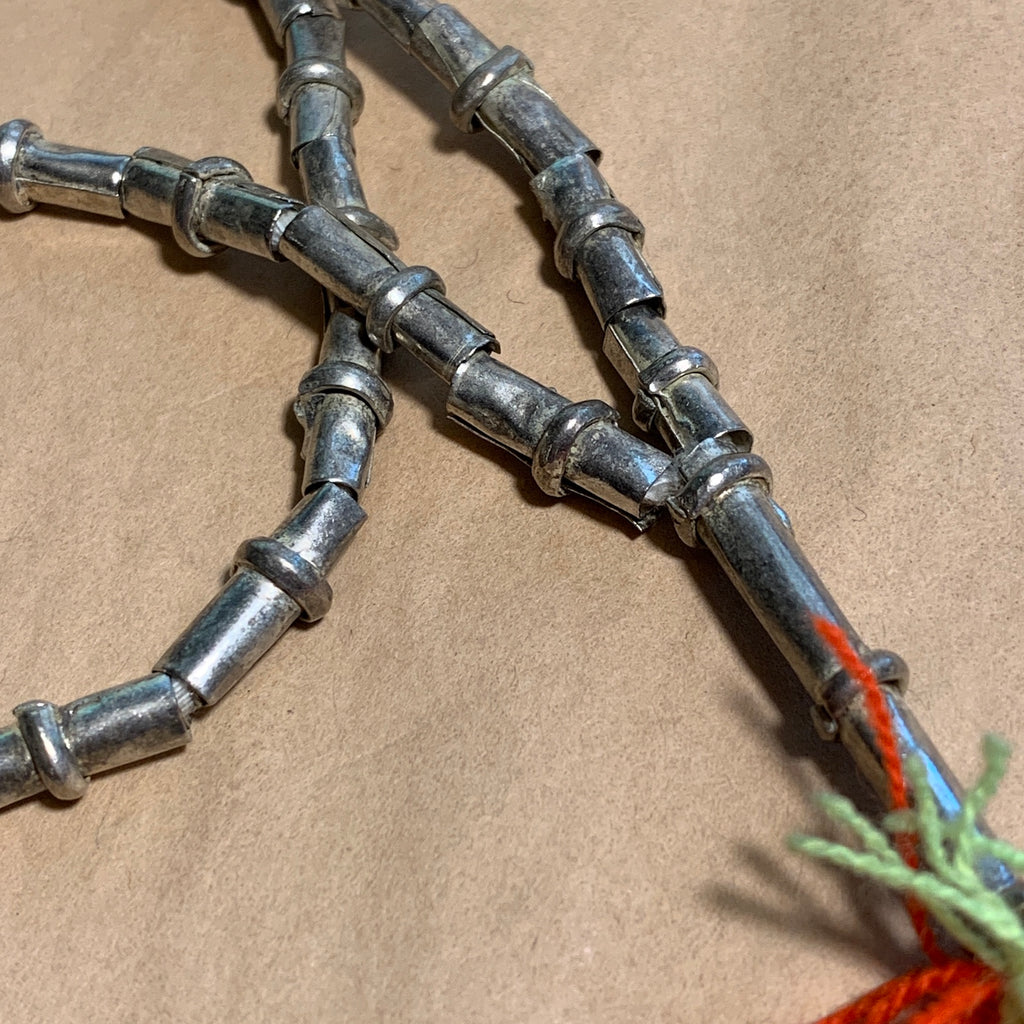 36" strand of prayer beads, hand-made in Ethiopia, vintage coin silver. Each bead is approximately 16mm long x 5mm diameter. Vintage strand from the 1970's. 61 silver beads and one tassel bead. Bright old string at the bottom. Very funky, and not a high silver content.