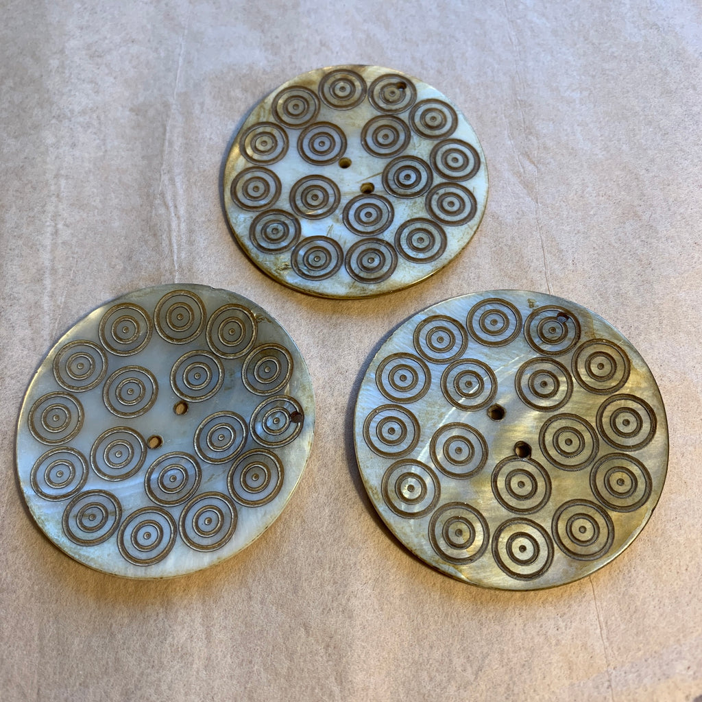 Early 1900's, beautifully handmade mother of pearl buttons with double-sided engraved "Eyes". These have 2 holes for sewing, with an additional hole at edge on 3 out of 4 buttons. These are large, 2.25 inches diameter. A traditional style from early 1900's Afghanistan. Price is for one button, and could be designed in a necklace!