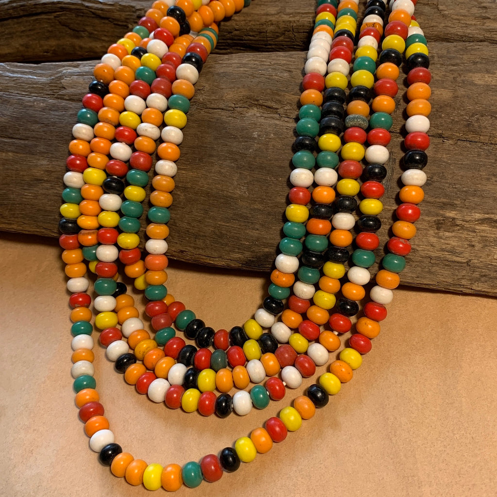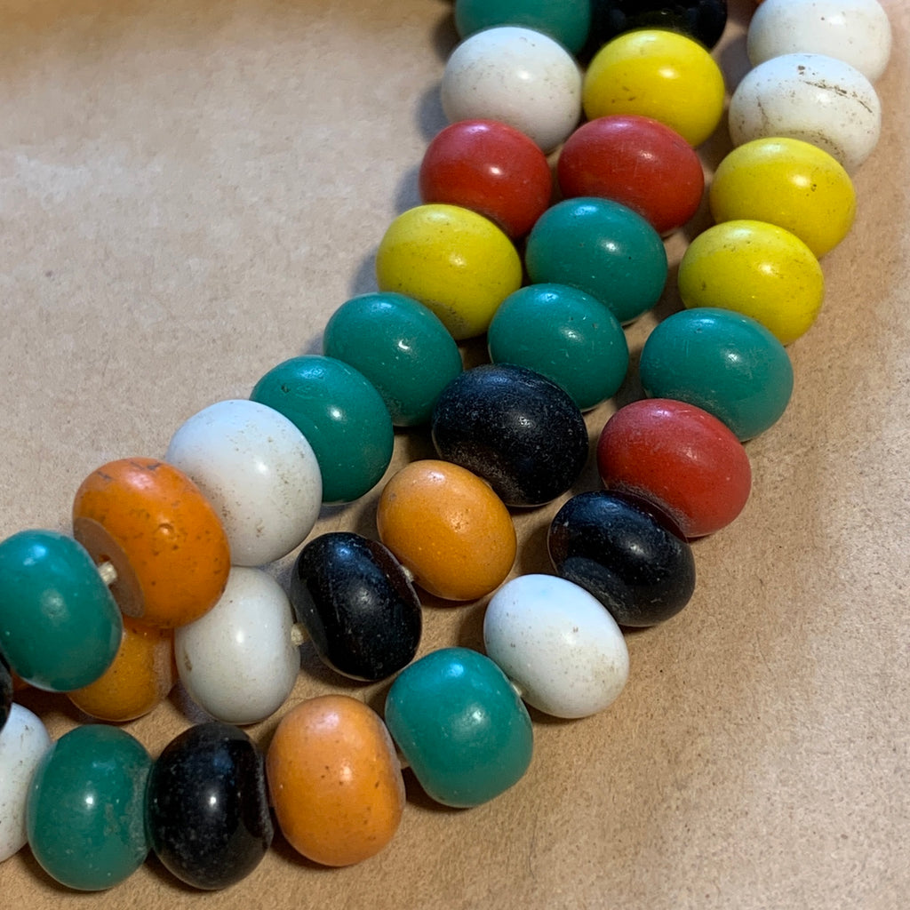 Strand of round saucer-shaped beads, mixed colors. Orange, yellow, red, black, white, and green mix. These beads were popular with the Fulani Tribe of West Africa. The saucers are 9mm diameter x 6mm tall, 1mm holes. 24 inches long, great Rasta colors! African dealers call this bead "Binta Badjie", about 95 beads per strand.