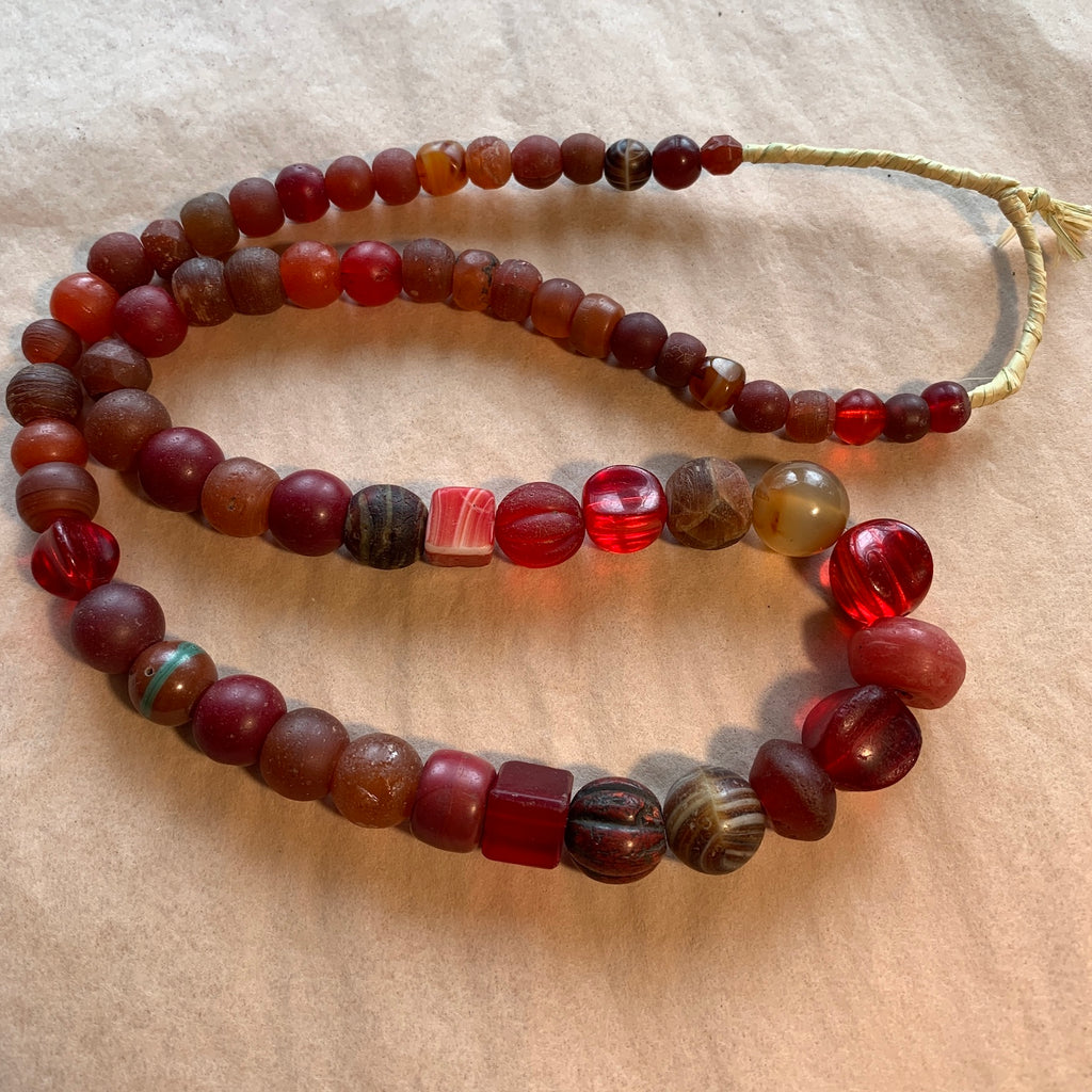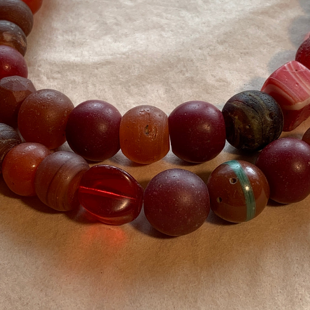 Red vaseline beads, early 1900's transparent greasy red ruby glass, variety of shapes, colors and sizes. 28 inch strand. Czech/Bohemian glass traded in West Africa. Beads are a real mix, some carnelian glass, some brownish-red, some ruby red. Sizes range on this graduated strand from 9mm diameter to 19mm. Hole sizes range from 1mm-3mm. 62 beads in the strand, with one carnelian stone bead, one brown-brick with green stripe, one transparent melon... just a wide variety! Can be worn as is, or take apart for many projects!