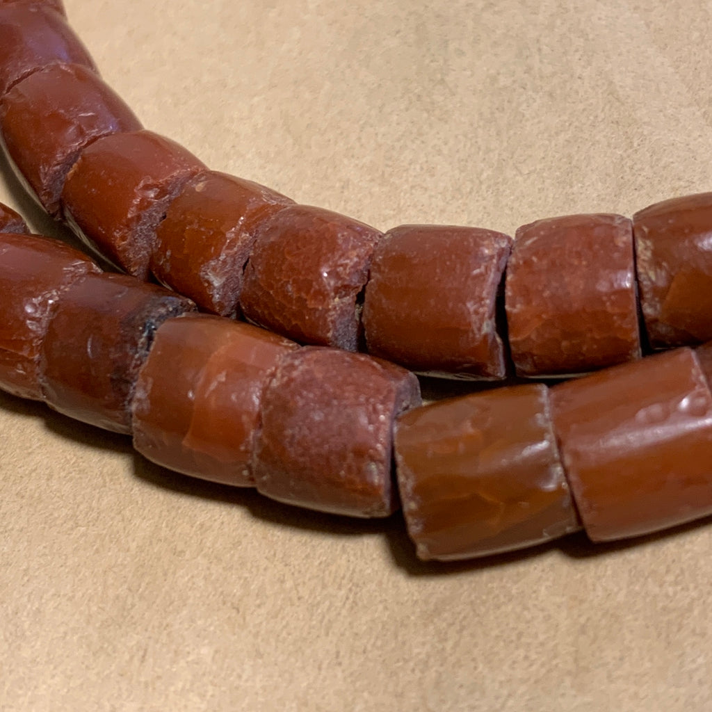 Beautiful 28" strand of bow-drilled, smooth short cylindrical red jasper beads, from Djenne, Mali approximately 1000 years old with uniform beads. Average size is 7mm diameter x 6mm tall, 97 beads total. Wide holes, tapering to small 1mm holes. Very rare!
