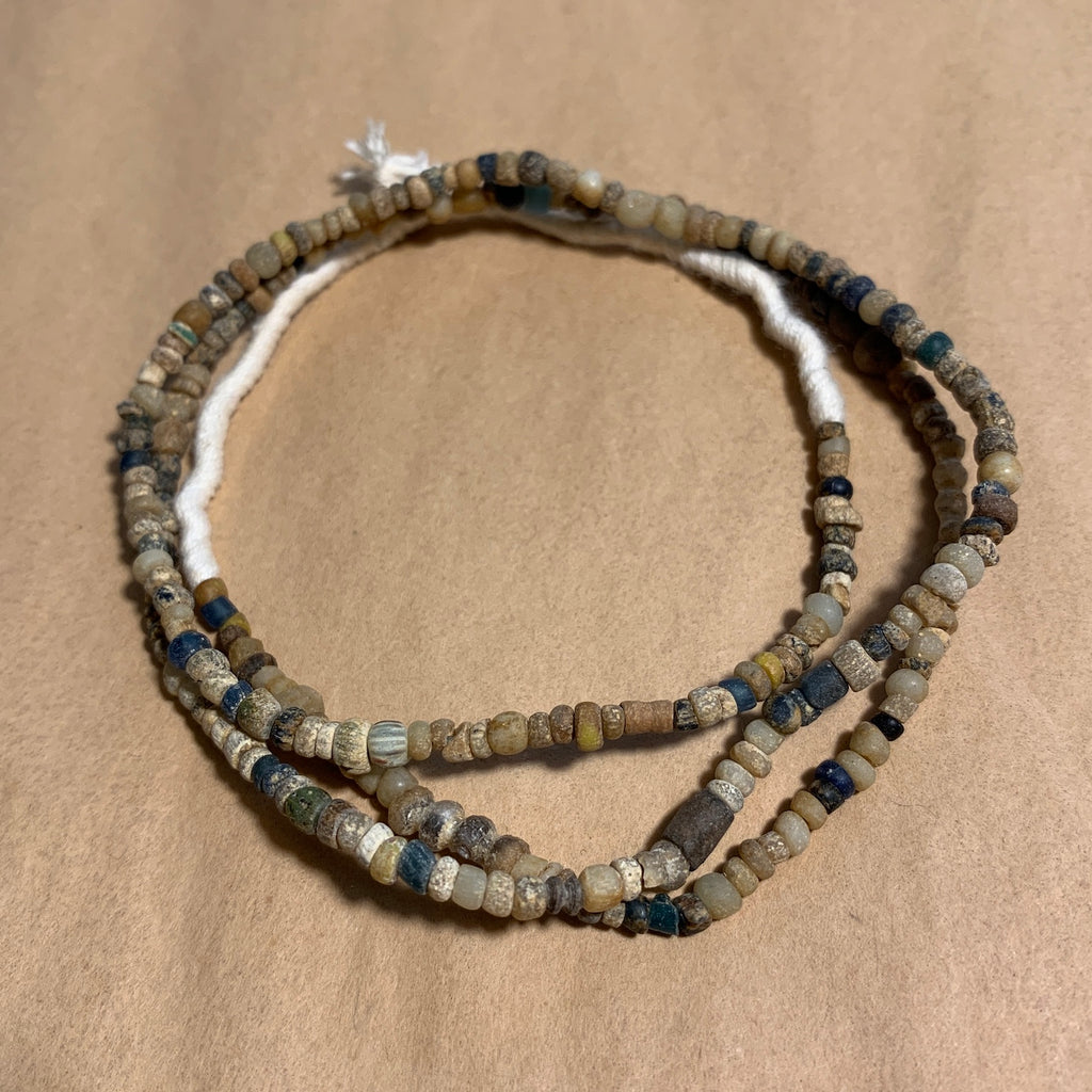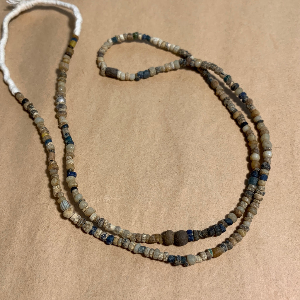 24" strand of 2000+ year old Roman Era glass beads. Awesome collection of mixed beads in a lovely grey, blues and beige with calcification (see photos for examples). They were excavated in the ancient city of Djenné (which is near Timbuktu) in Mali. The average bead size ranges from  3mm x 4.5mm diameter with very small holes. These are quite rare now.