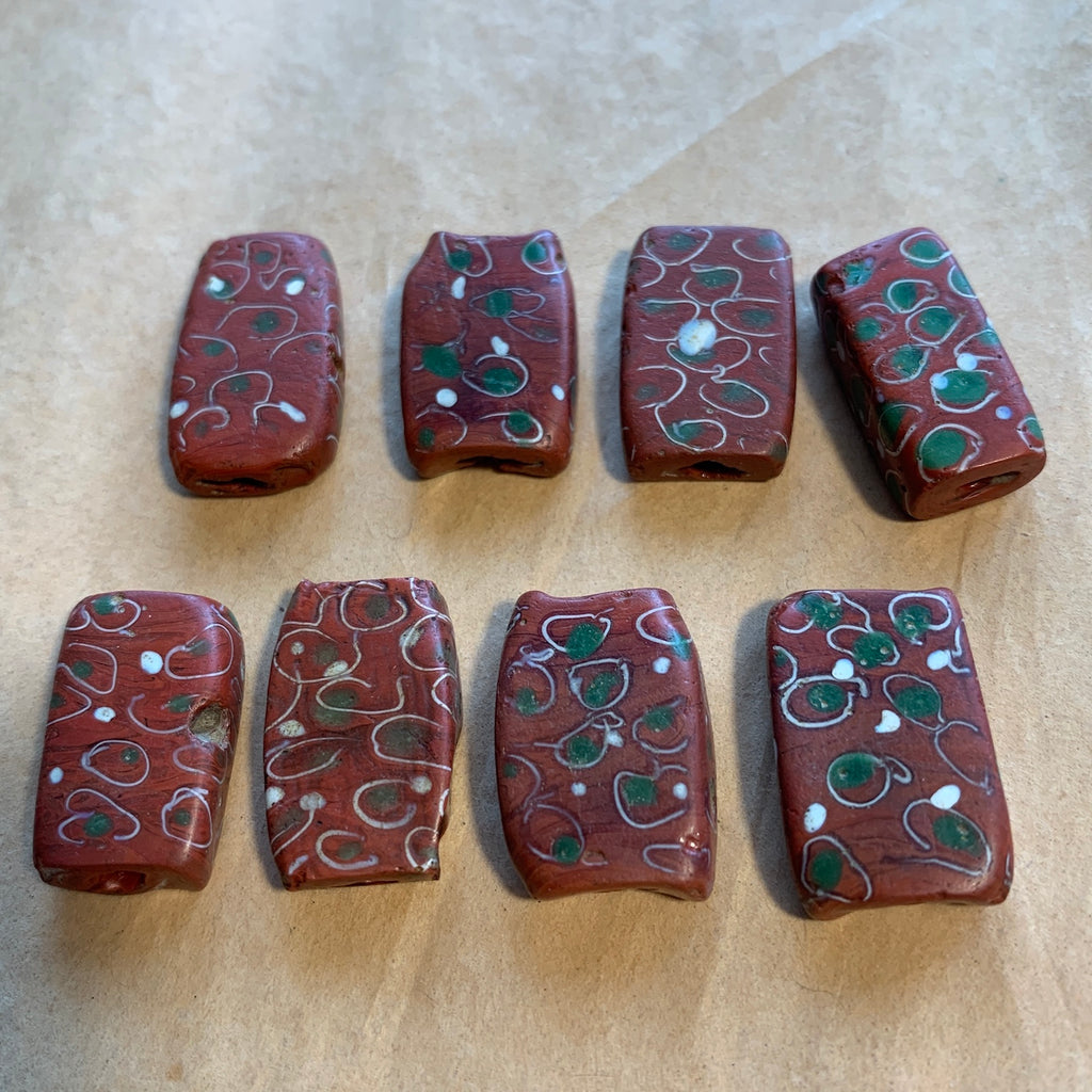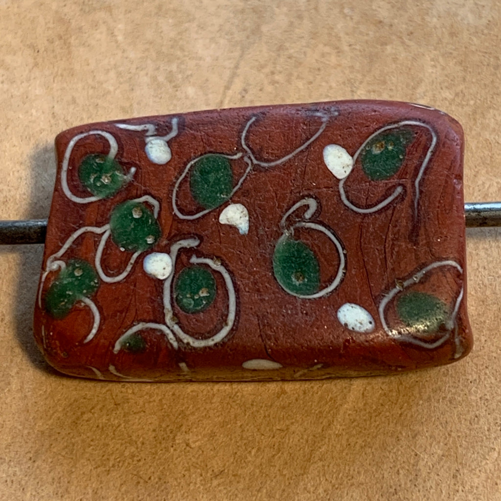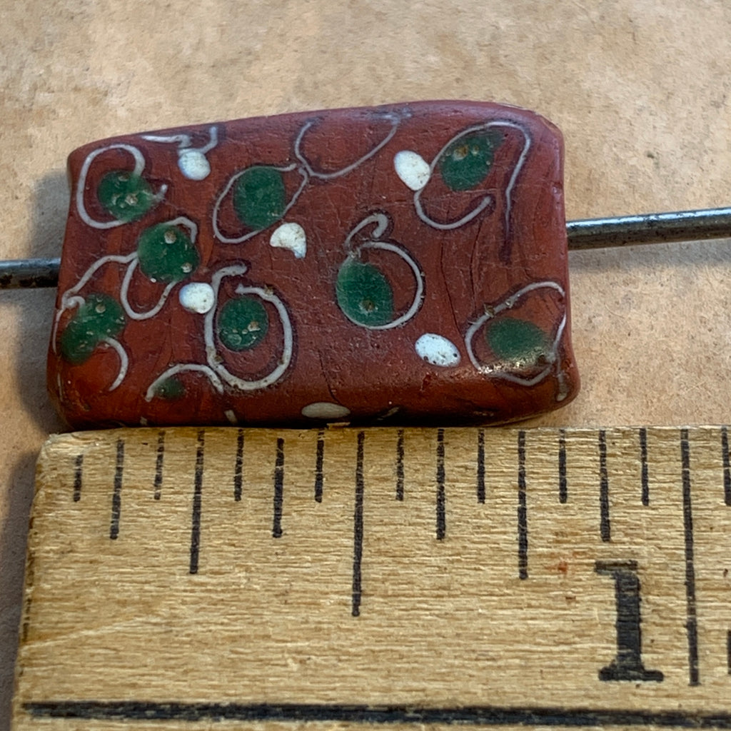 This rare glass bead was handmade, lamp-wound in Italy in the mid 1800's. Referred to as "tabular", this rectangular shape has an unusual design of brick-red base with green and white "eyes". Unique and rare bead! 21mm tall x 13mm across x 6mm thick, 2mm hole. Sold individually. Highly collectible, in good condition!