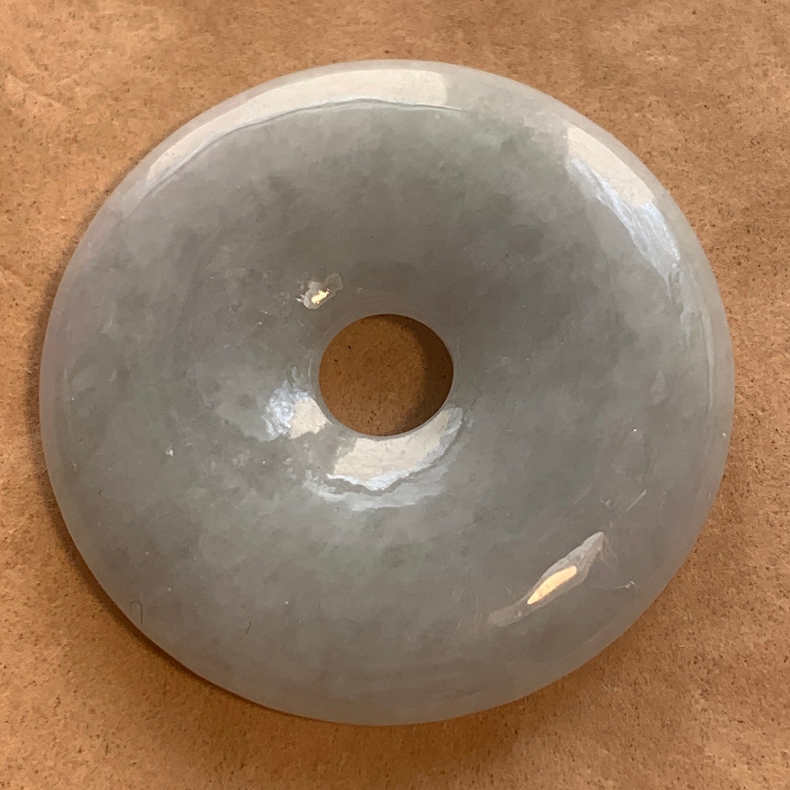 Lovely vintage Burmese lavender jade donut, hand-carved in China in the 1980's. Soft, luscious pale lavender color with a hint of green. 38mm diameter x 7mm thick, 6mm hole. Hand-carved smooth and simple design, 22 grams!